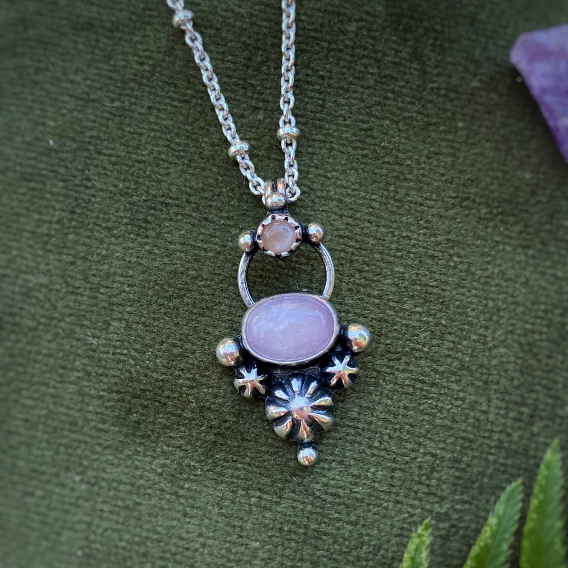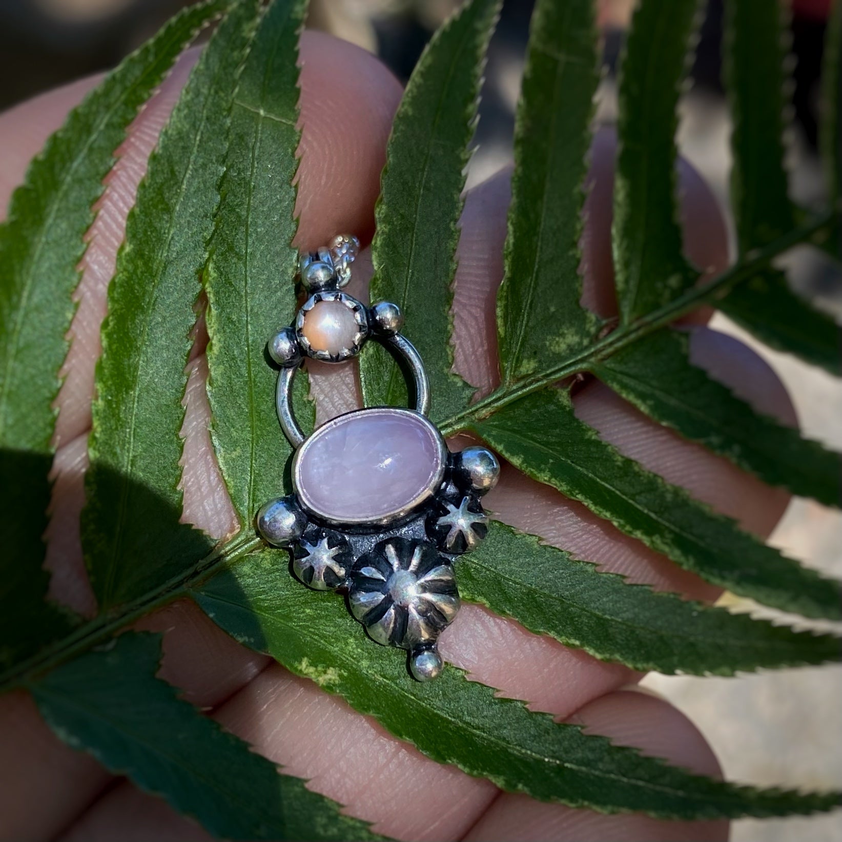 Shimmering kunzite and peach moonstone stones set in a handmade sterling silver setting.