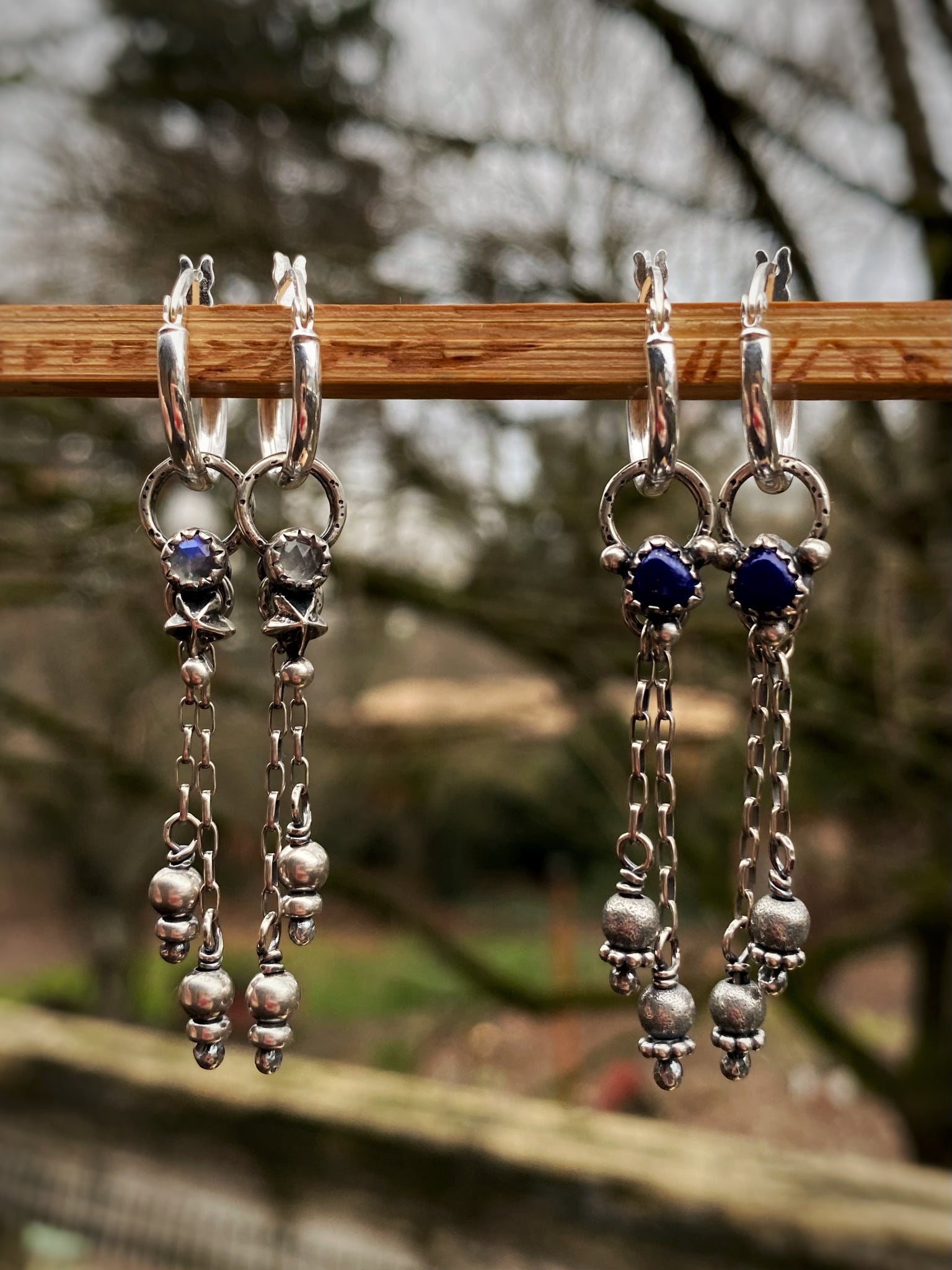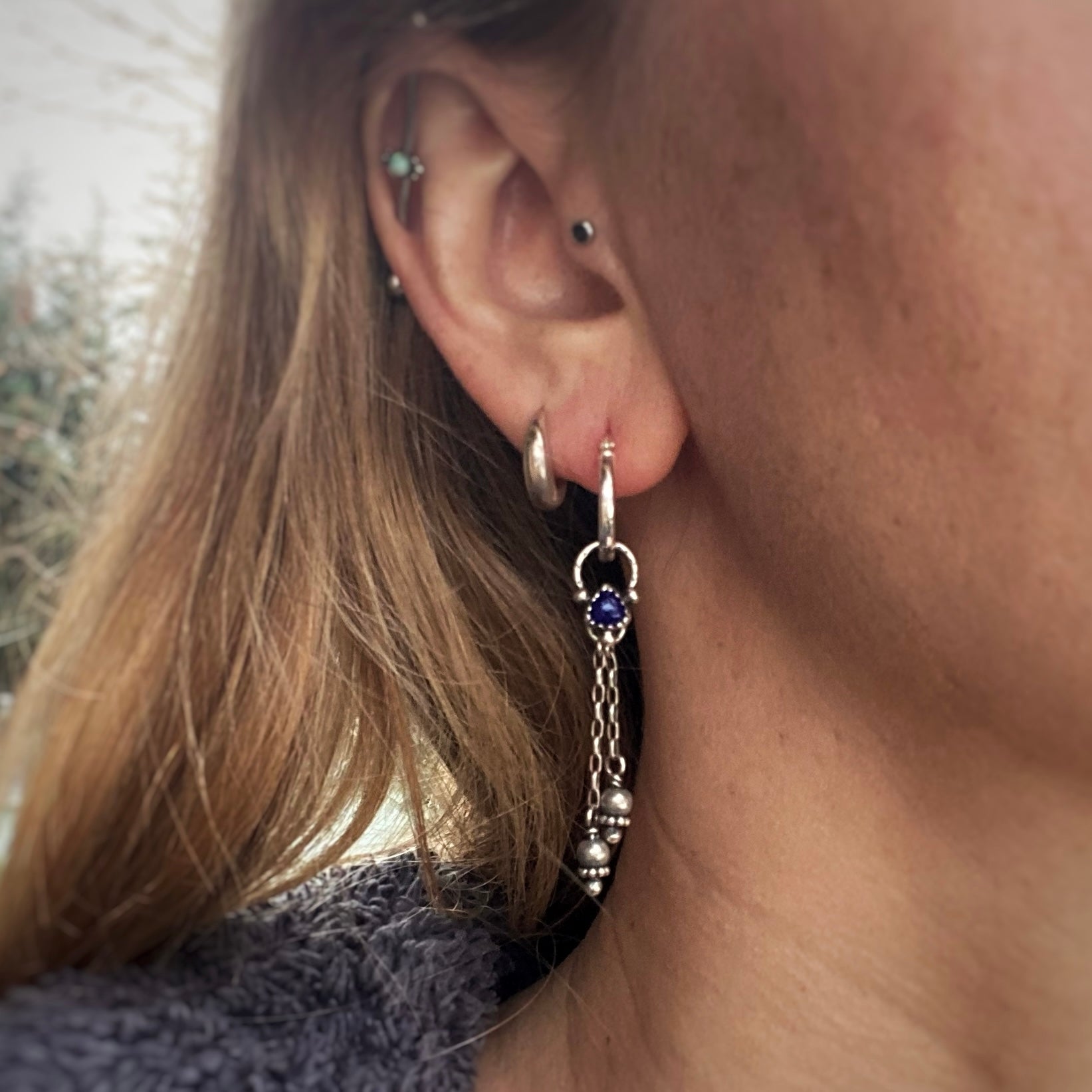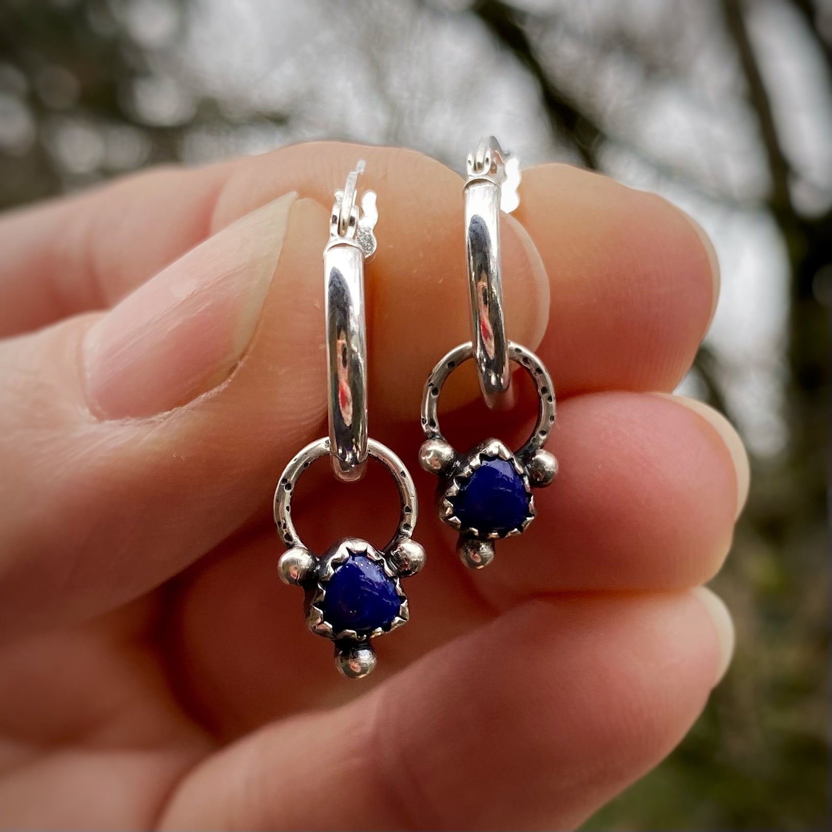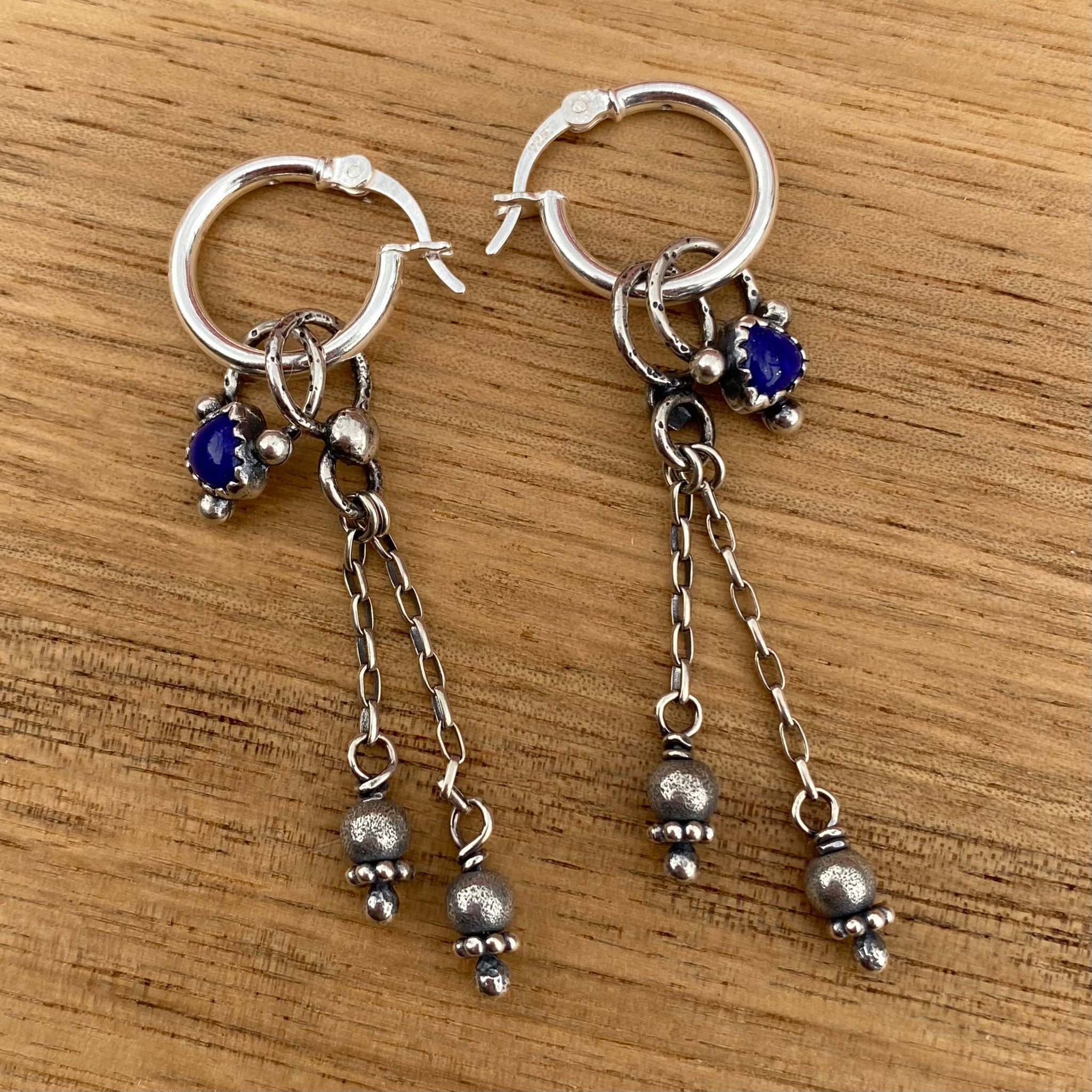Made for mixing and matching! This set includes a pair of hinged silver hoops, along with handmade trillion lapis lazuli charms, and handmade beaded fringe charms — that you can wear and pair any way you like. Wear the hoops by themselves, one of each, matching charms, or even both charms on the hoop at once. They’re so versatile!