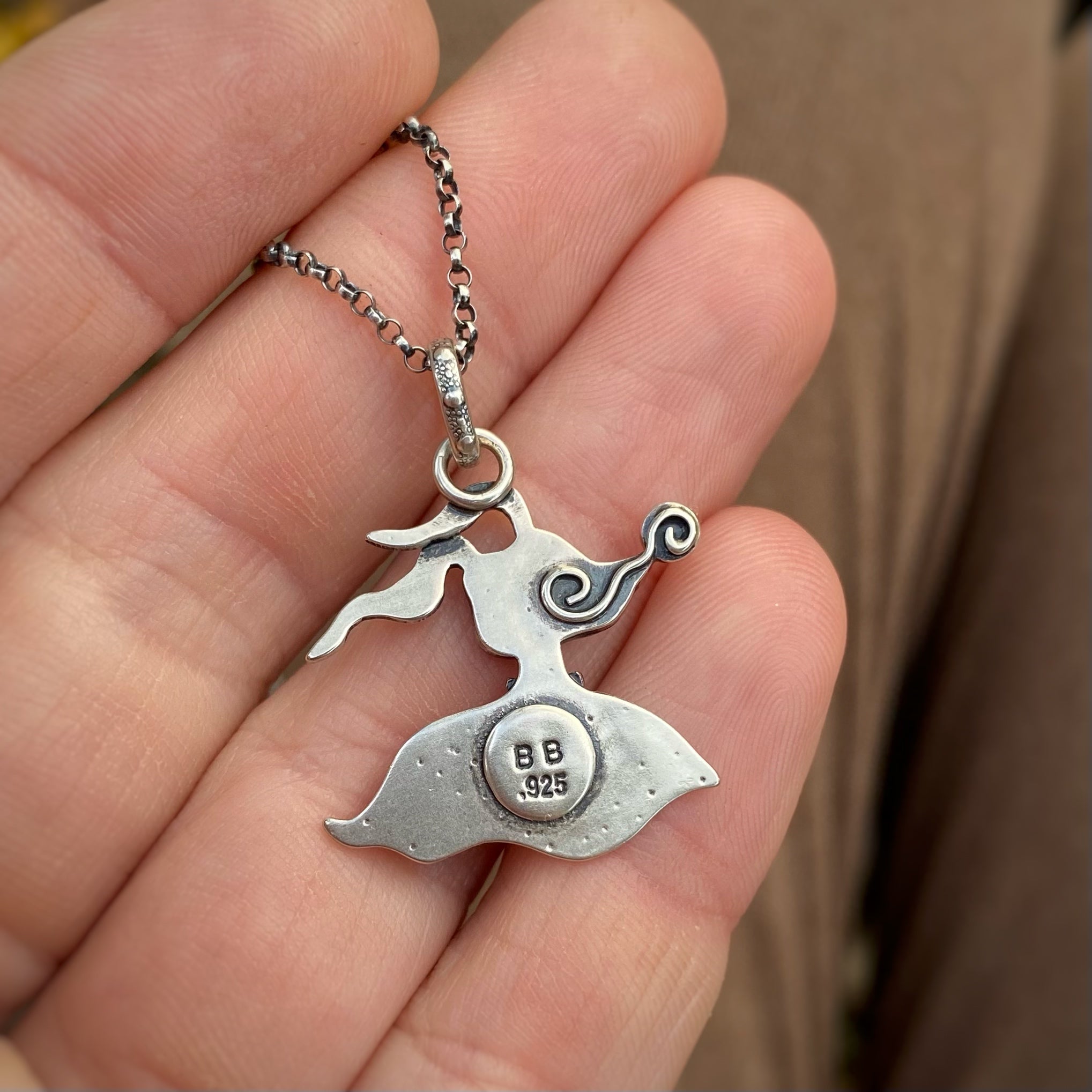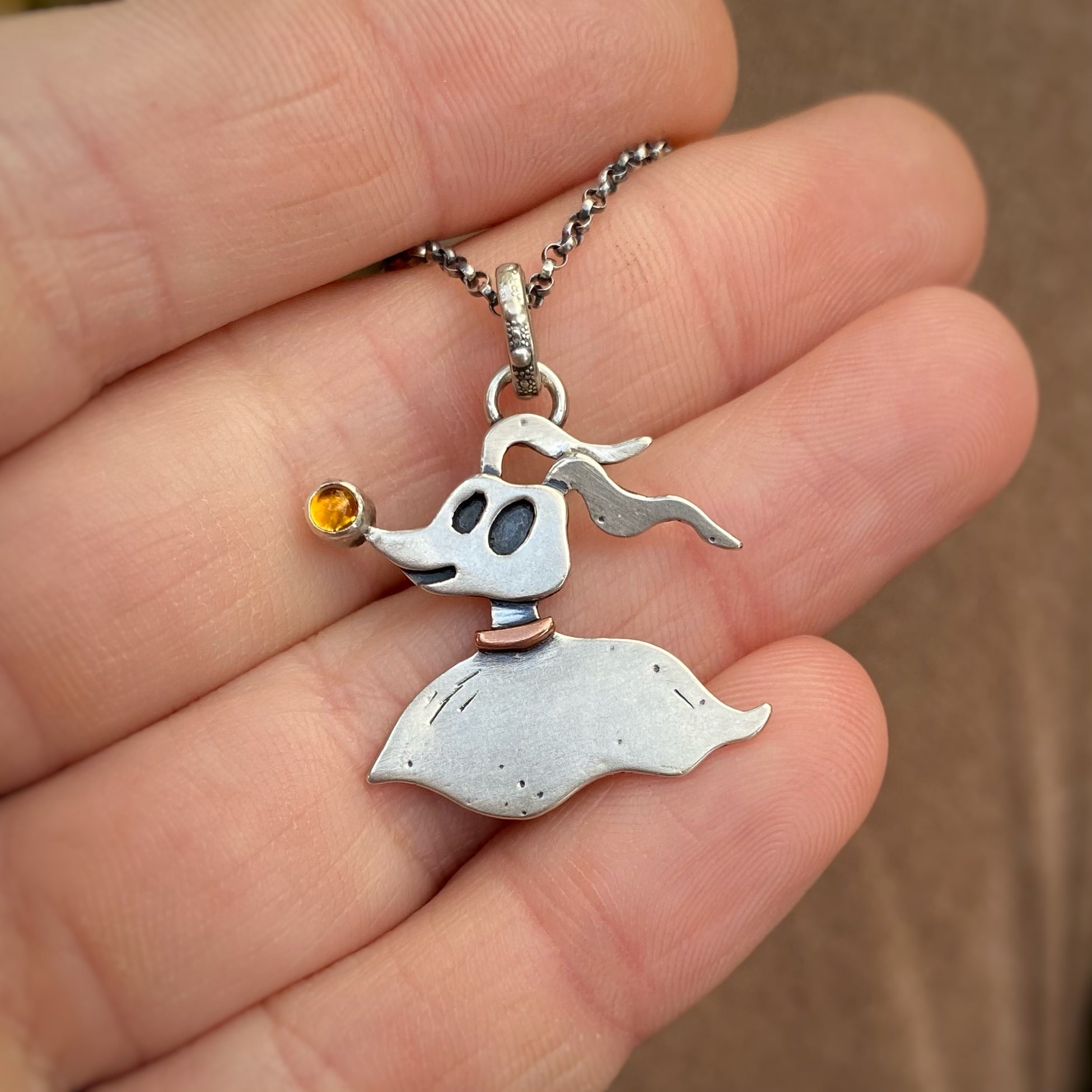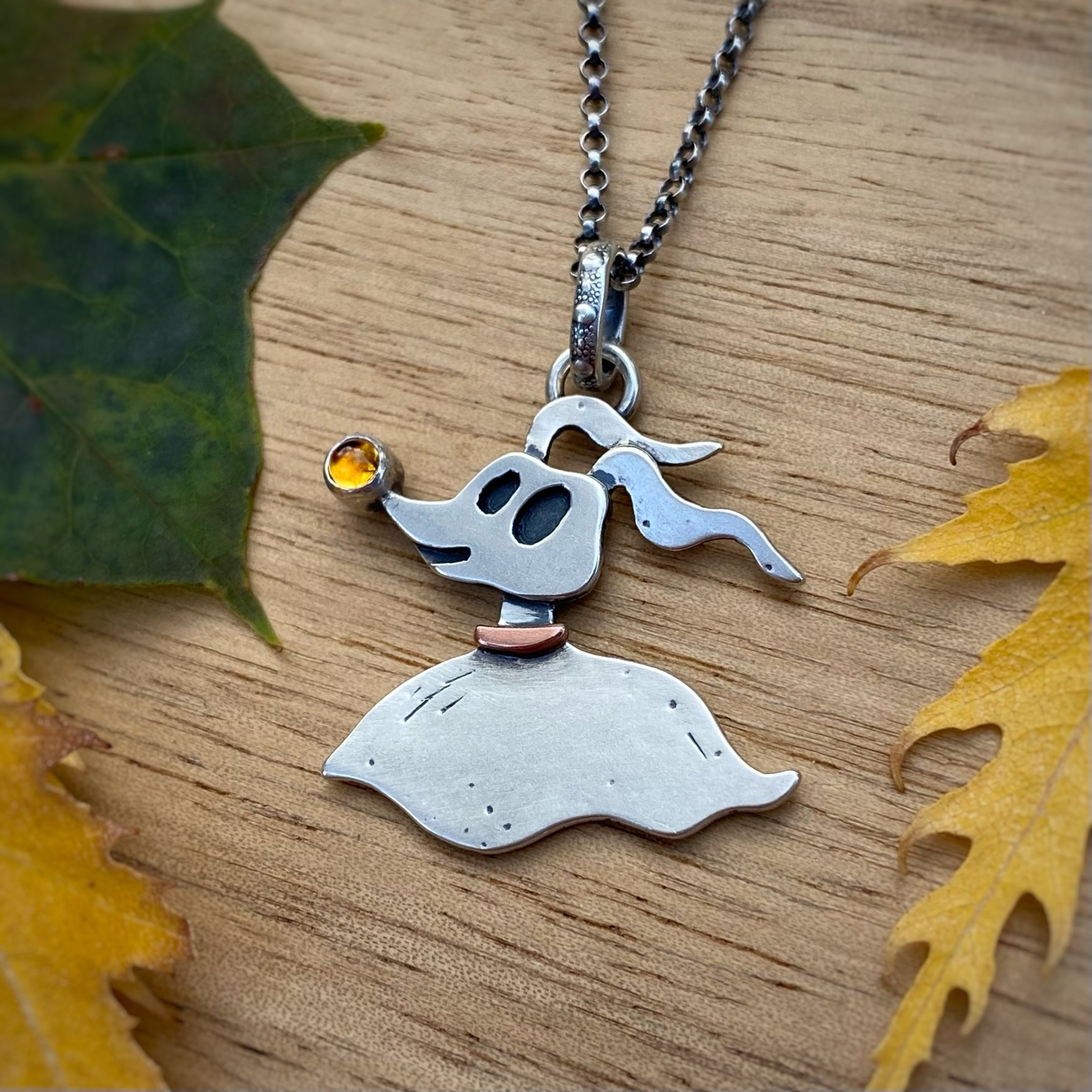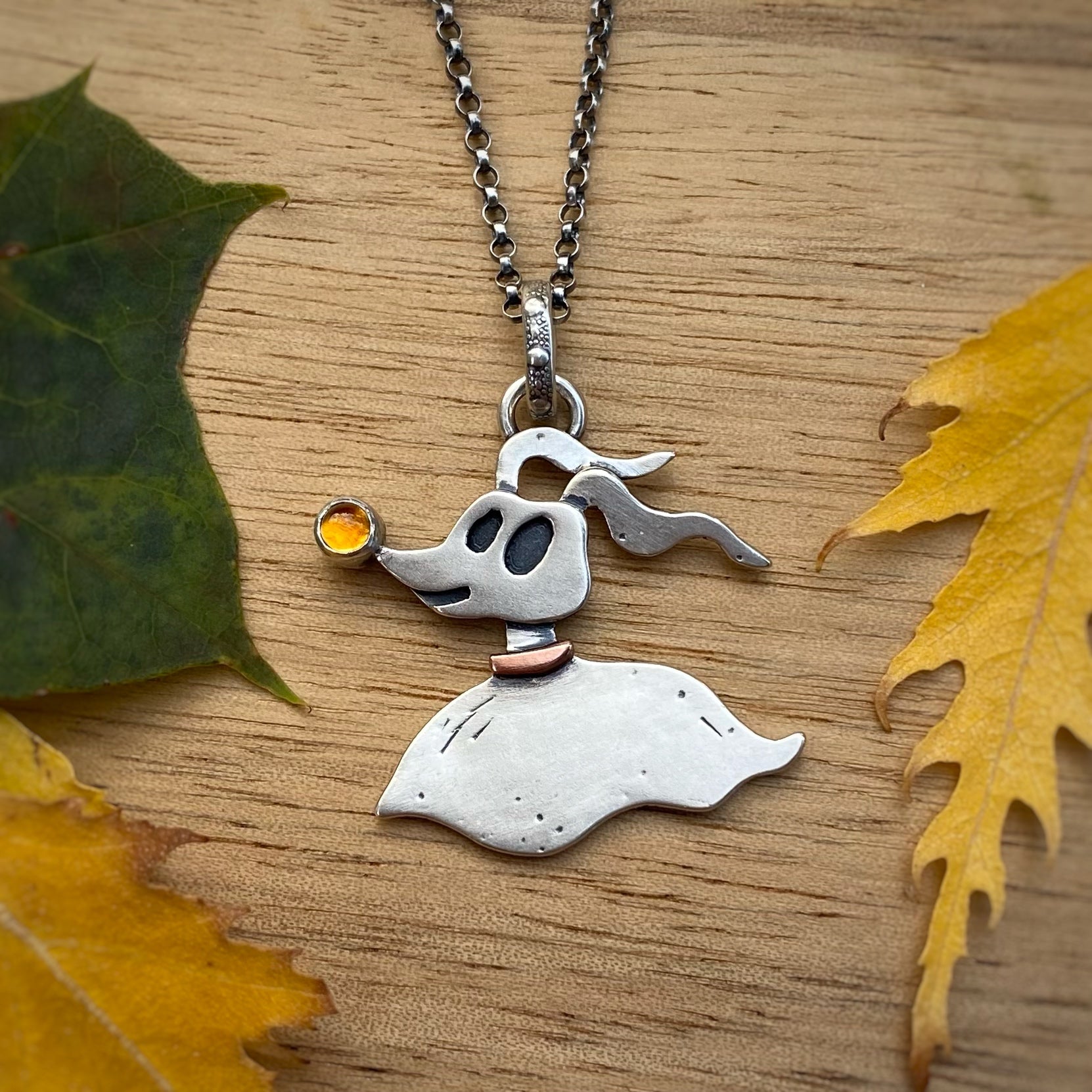 The sweetest spooky sidekick! I’ve handmade this iconic pup from layered sterling silver, all hand-drawn and hand-sawn, and set a tiny citrine for his pumpkin nose!