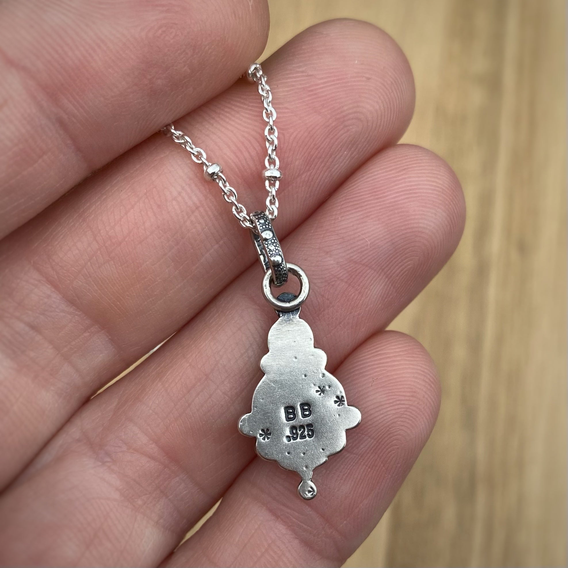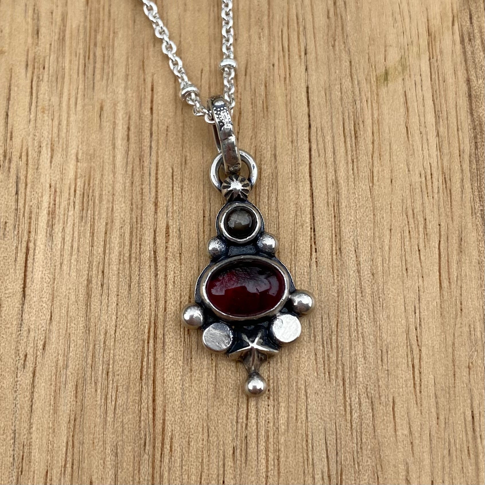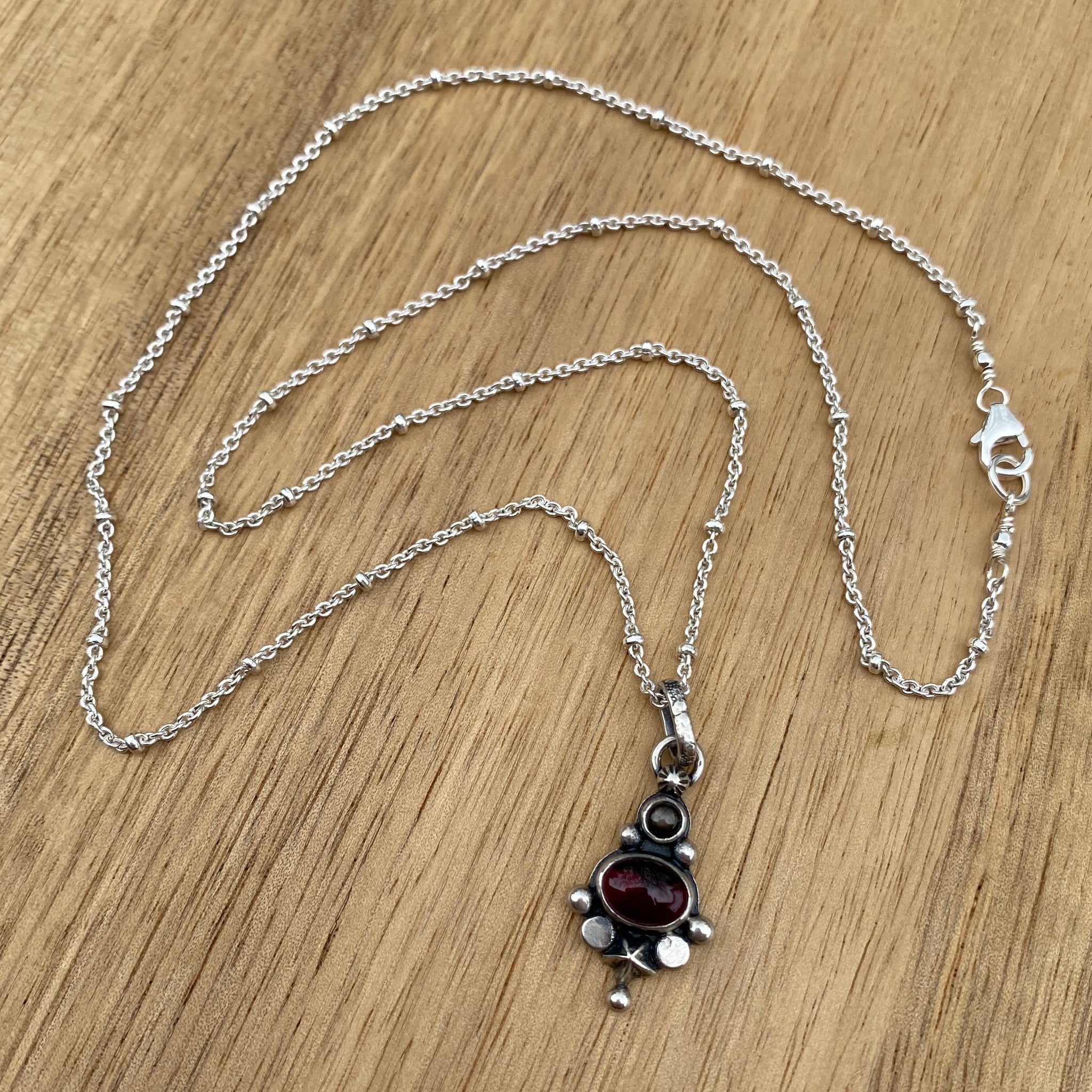 Lots of little details packed into these tiny statement necklaces! I’ve set a beautiful garnet and tiny black sapphire stone into a completely handmade sterling silver setting.