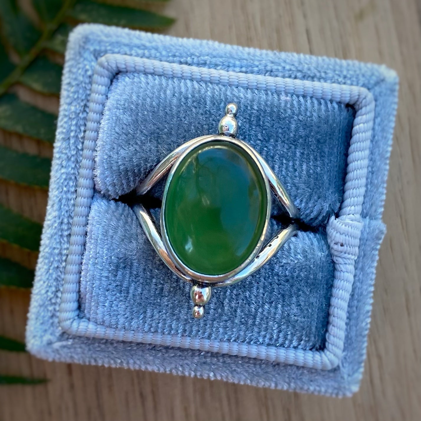 A beautiful high-domed green serpentineĀ set in a handmade sterling silver setting; featuring some light texture all around, shiny solid dots on the ends, and a sturdy & comfy split band.