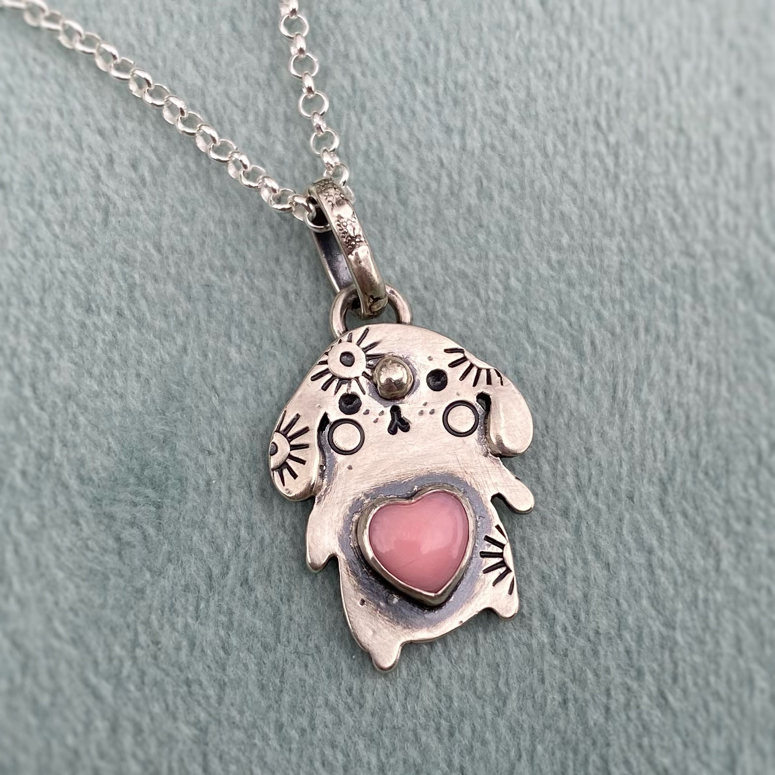 When you find the cutest little heart stones EVER, they definitely need to go with a cute little face! I’ve set a queen conch shell heart in the belly of a completely handmade sterling silver puppy dog figure.
