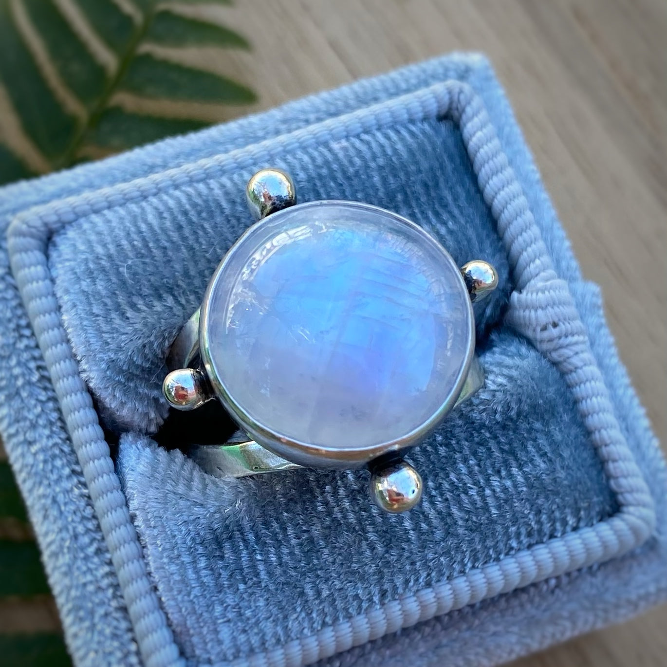 A flashy round rainbow moonstoneĀ set in a handmade sterling silver setting; featuring shiny solid dots all aroundĀ and a sturdy & comfy split band.