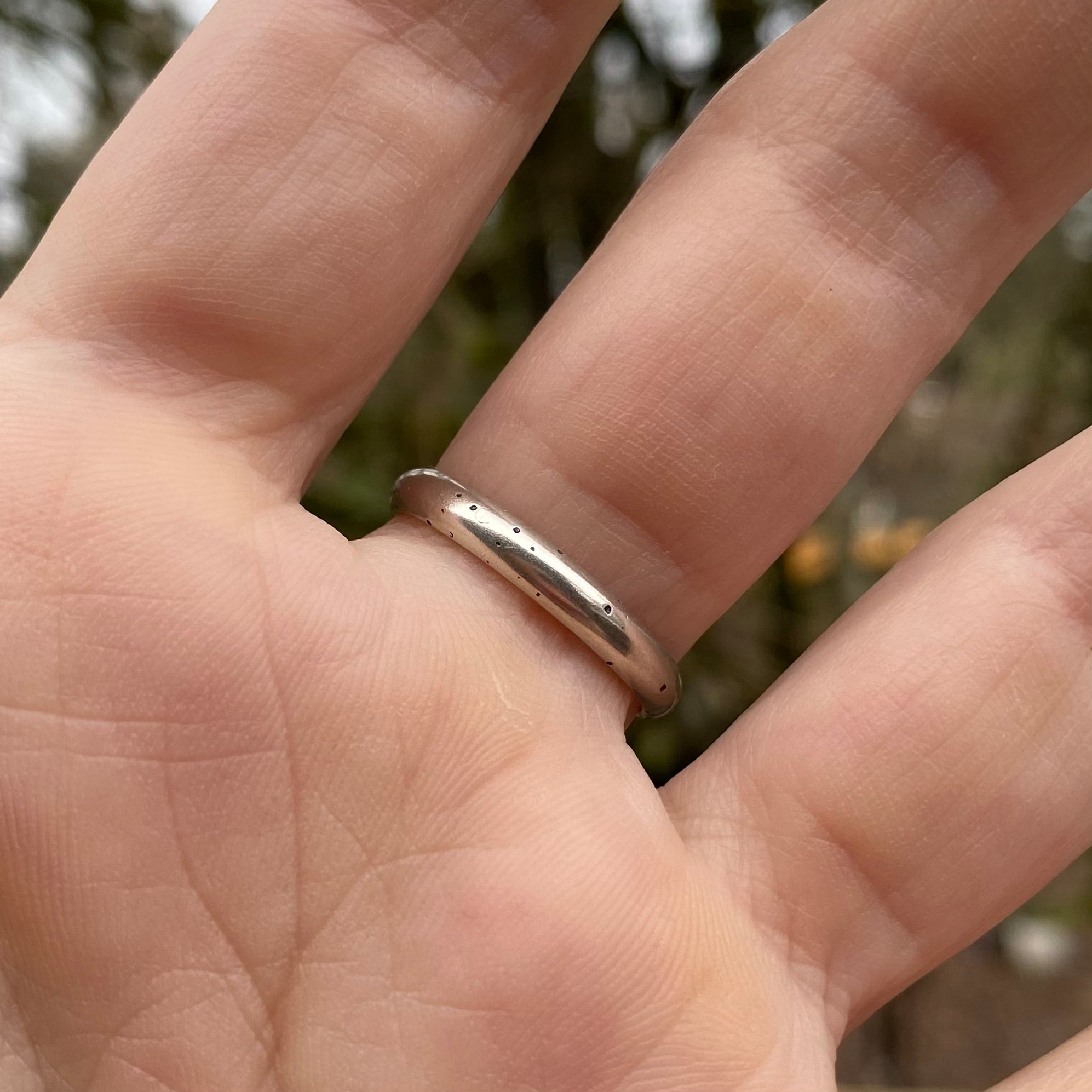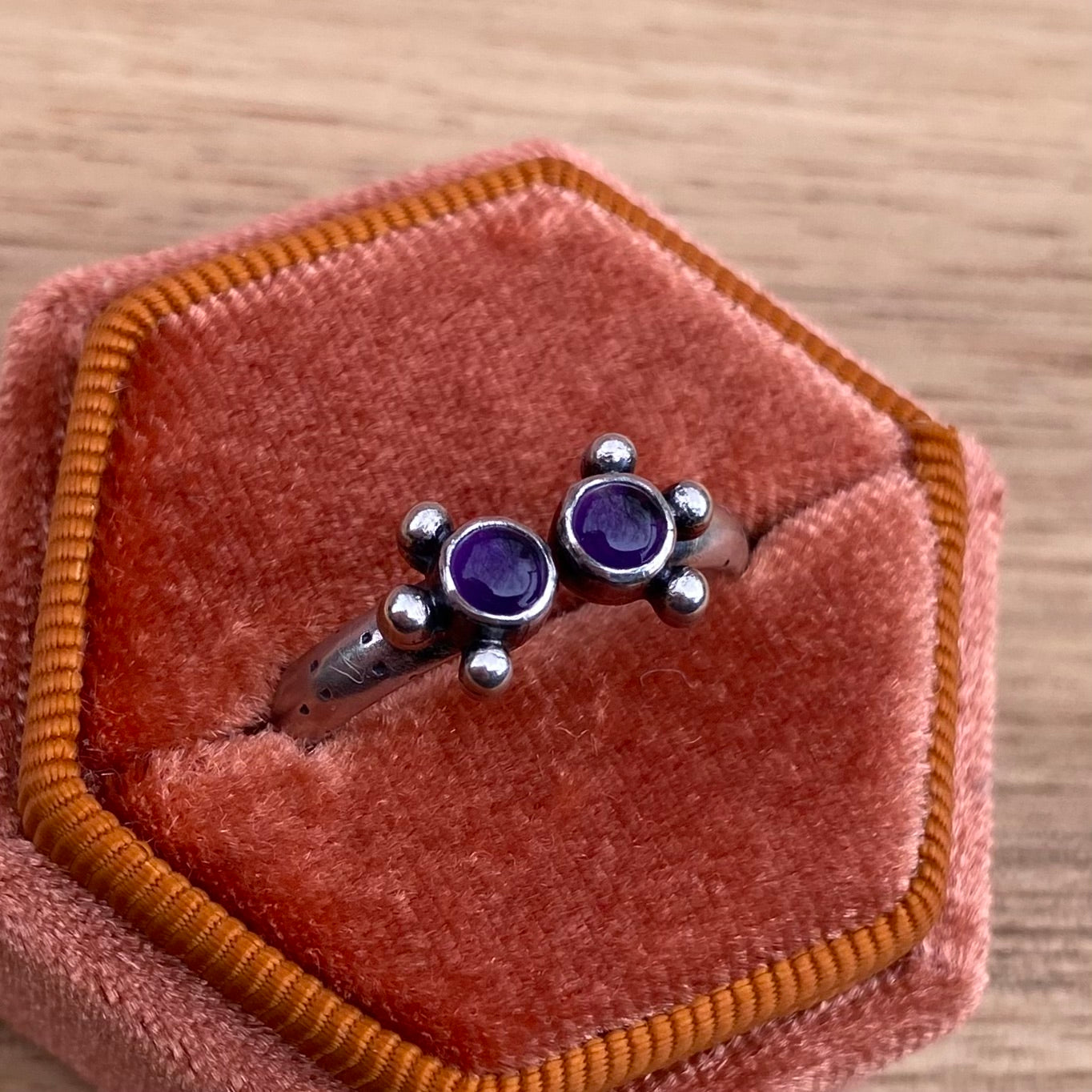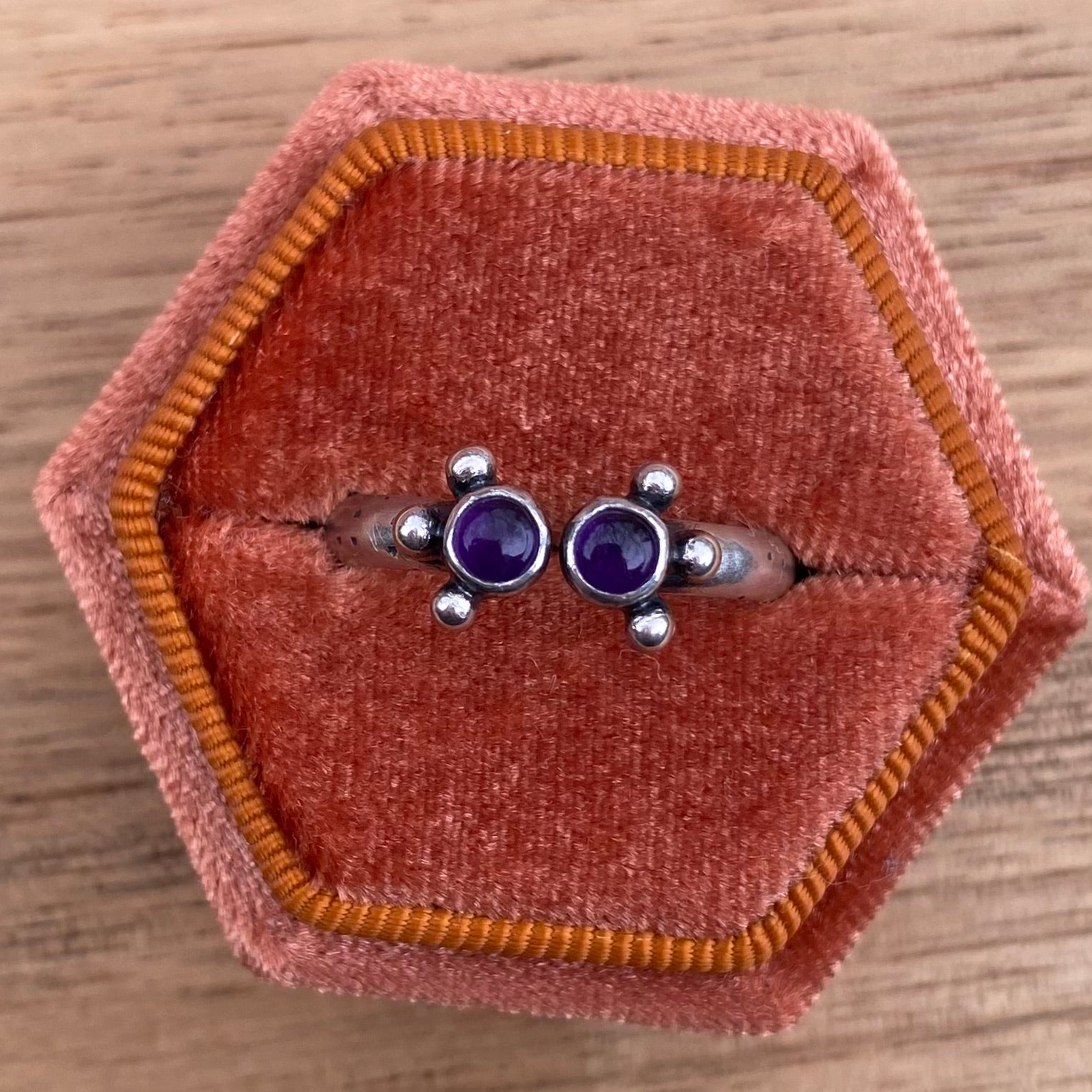 A lot of color in such a small amount of space! Two small round amethysts are set in a handmade sterling silver setting with silver ball accents and a comfortable, open half round band.