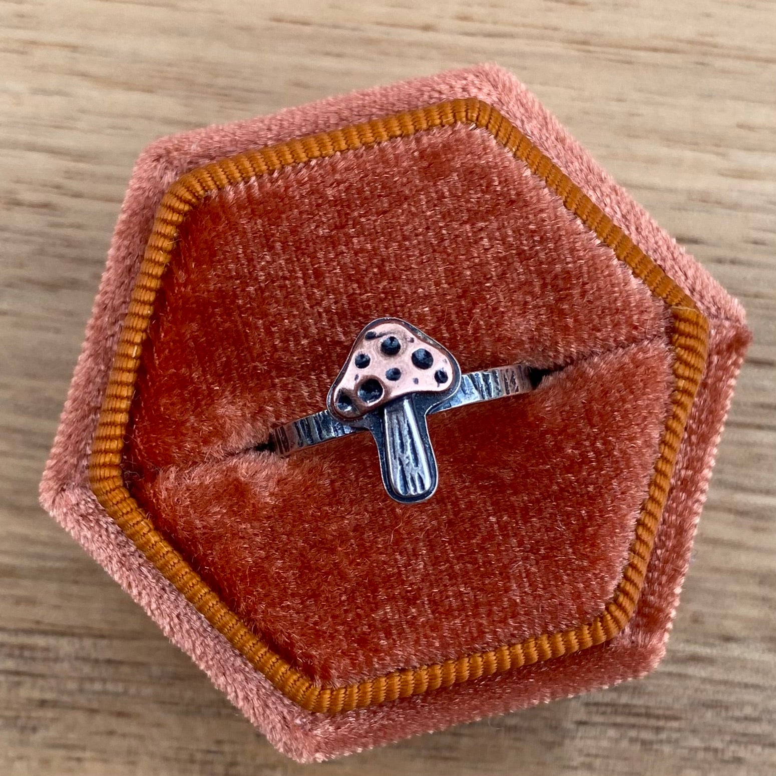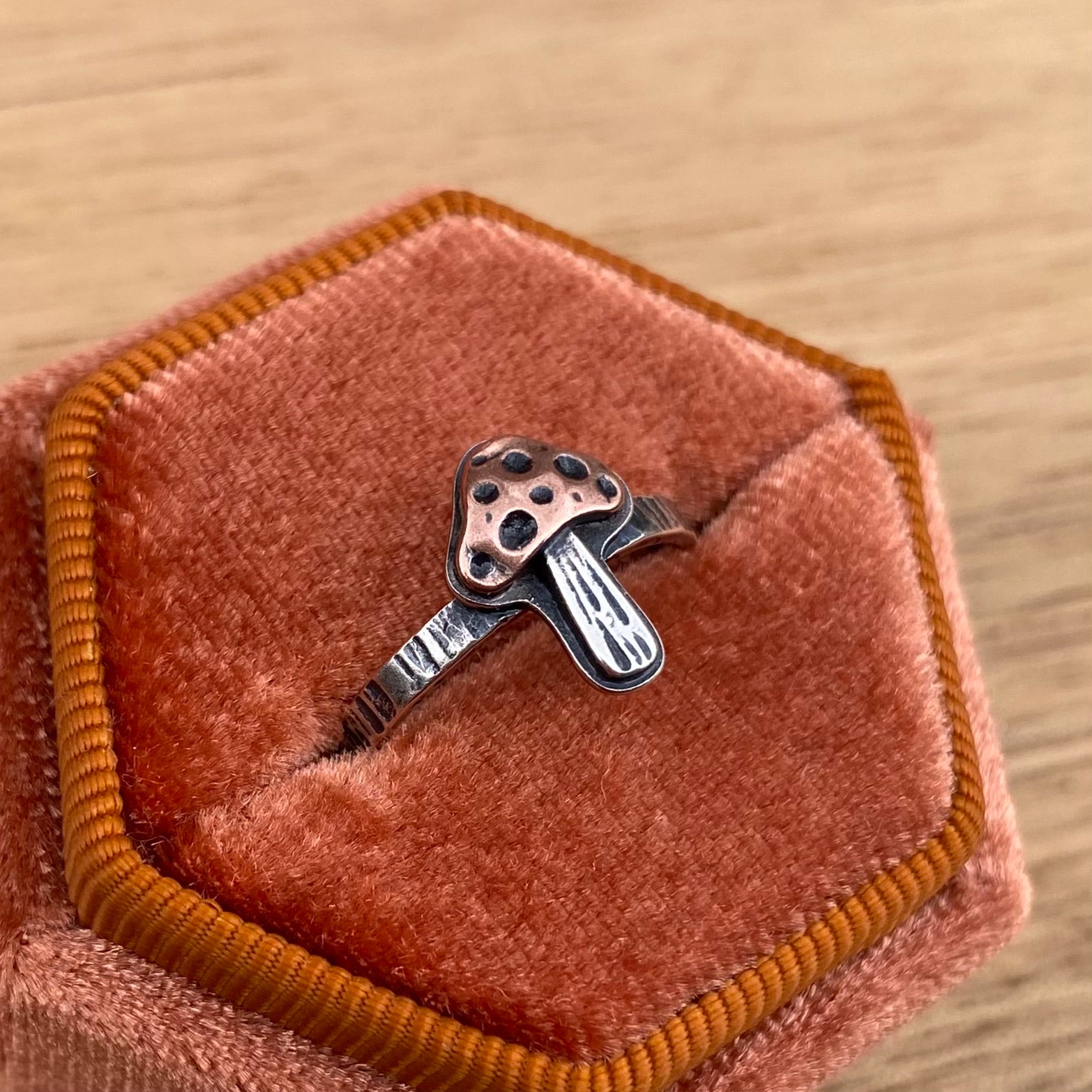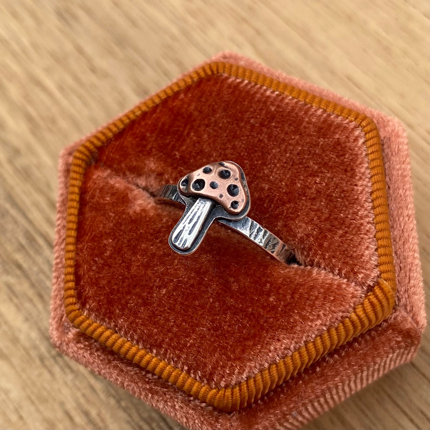 The sweetest little fungi! Handmade sterling silver ring with a copper mushroom top, lots of handstamped details, and a textured band.