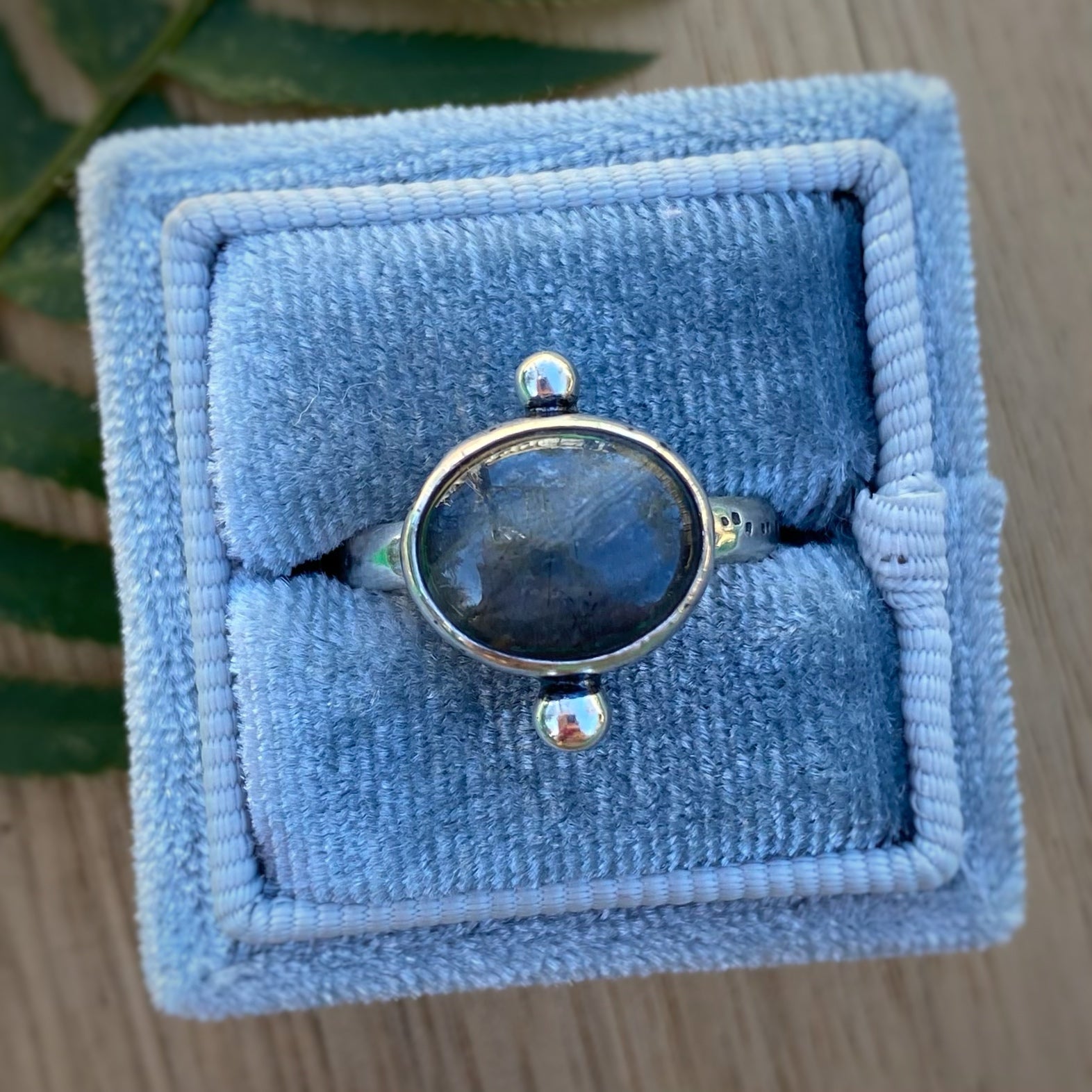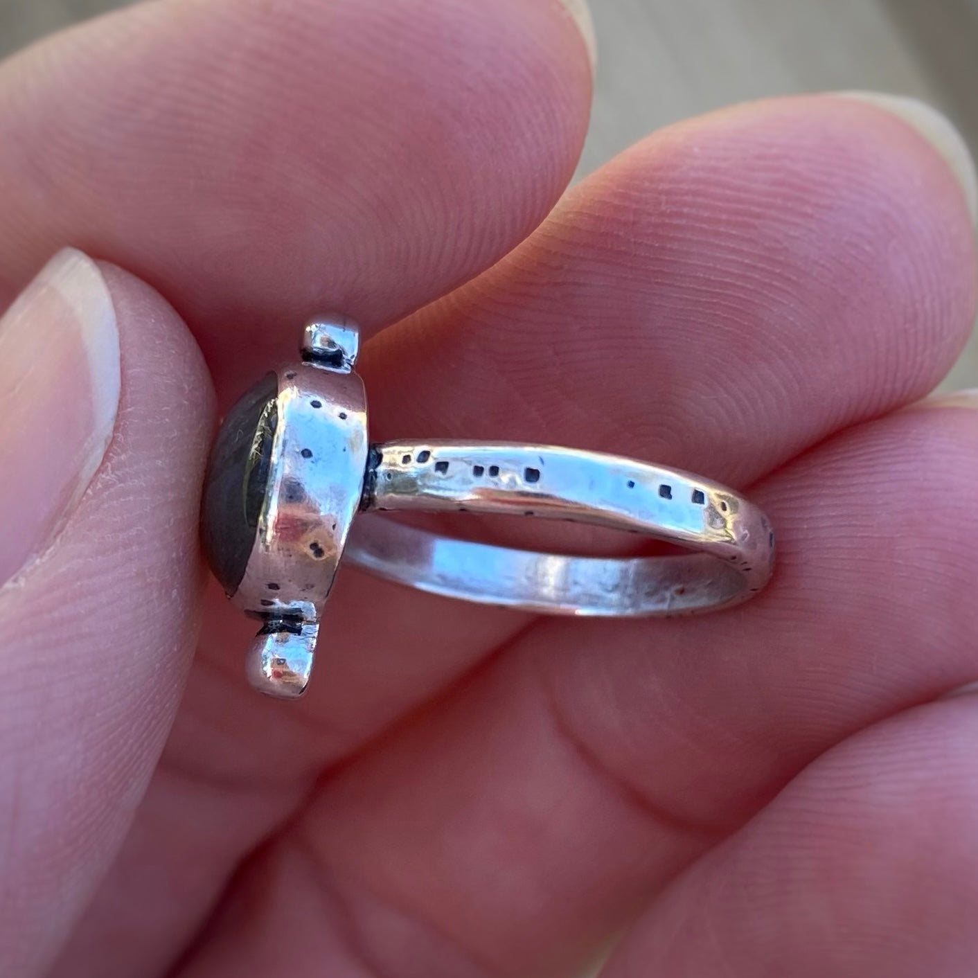 A subtle yet mystical labradorite set in a handmade sterling silver setting; featuring a textured pattern all over, shiny solid dots on the ends, and a comfy half-round band.