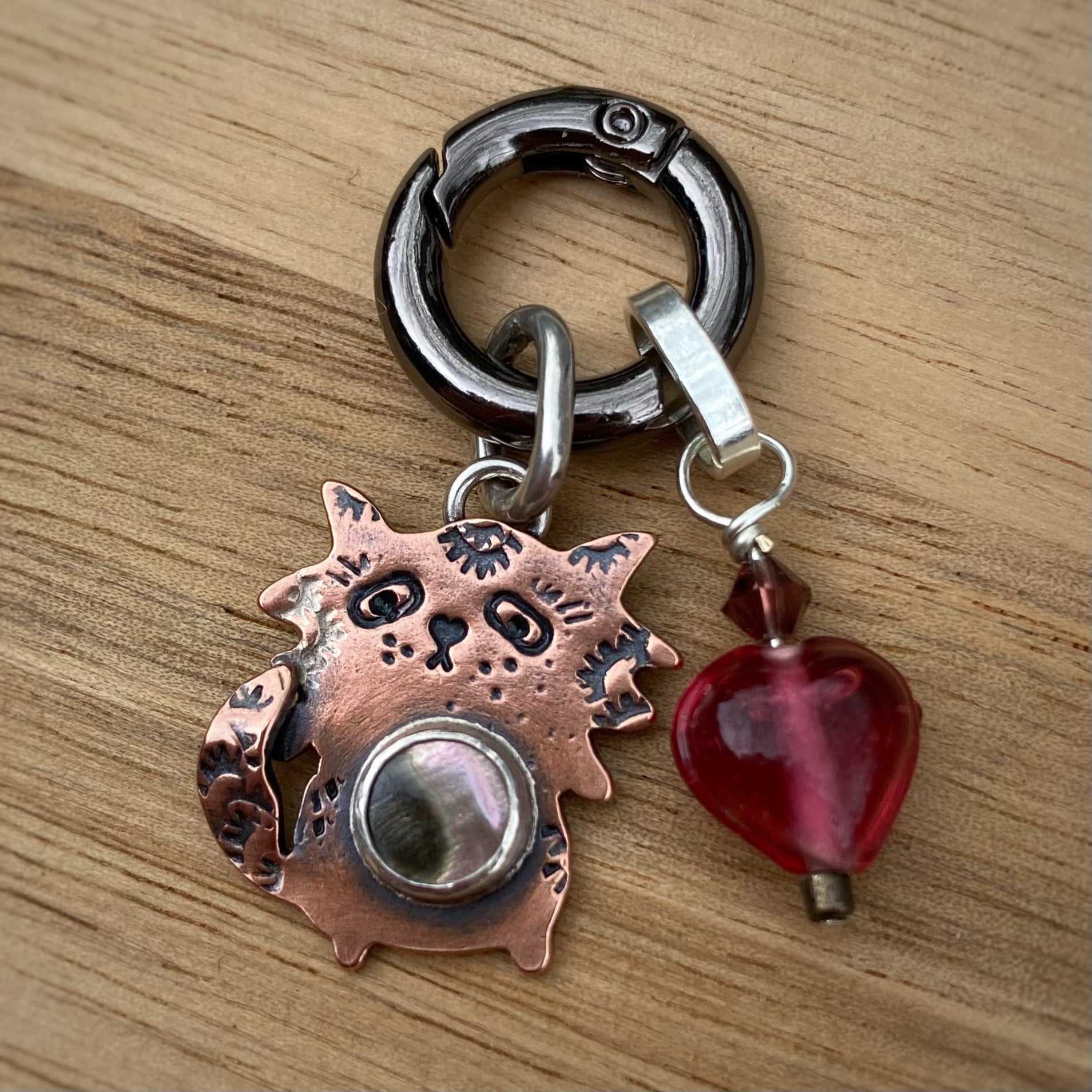 This charm is totally handmade from copper with sterling silver accents. The cabochon in his belly is abalone. The beads are glass. The findings on the attached bead charm are base metal, NOT sterling silver.