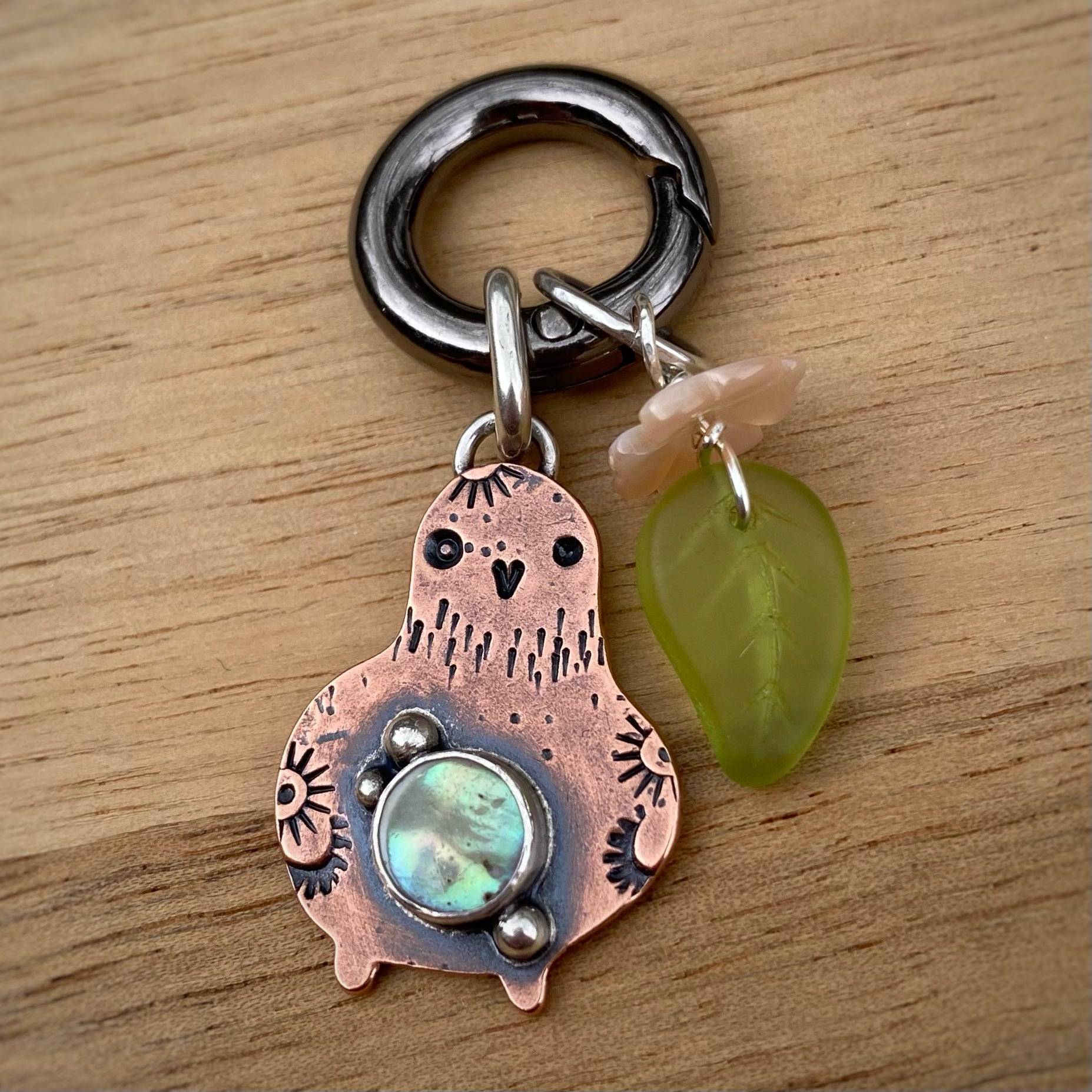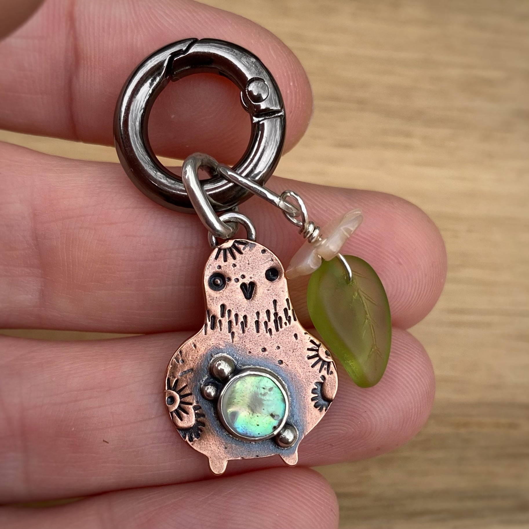 This charm is totally handmade from copper with sterling silver accents. The cabochon in his belly is abalone. The beads are glass and mother of pearl.