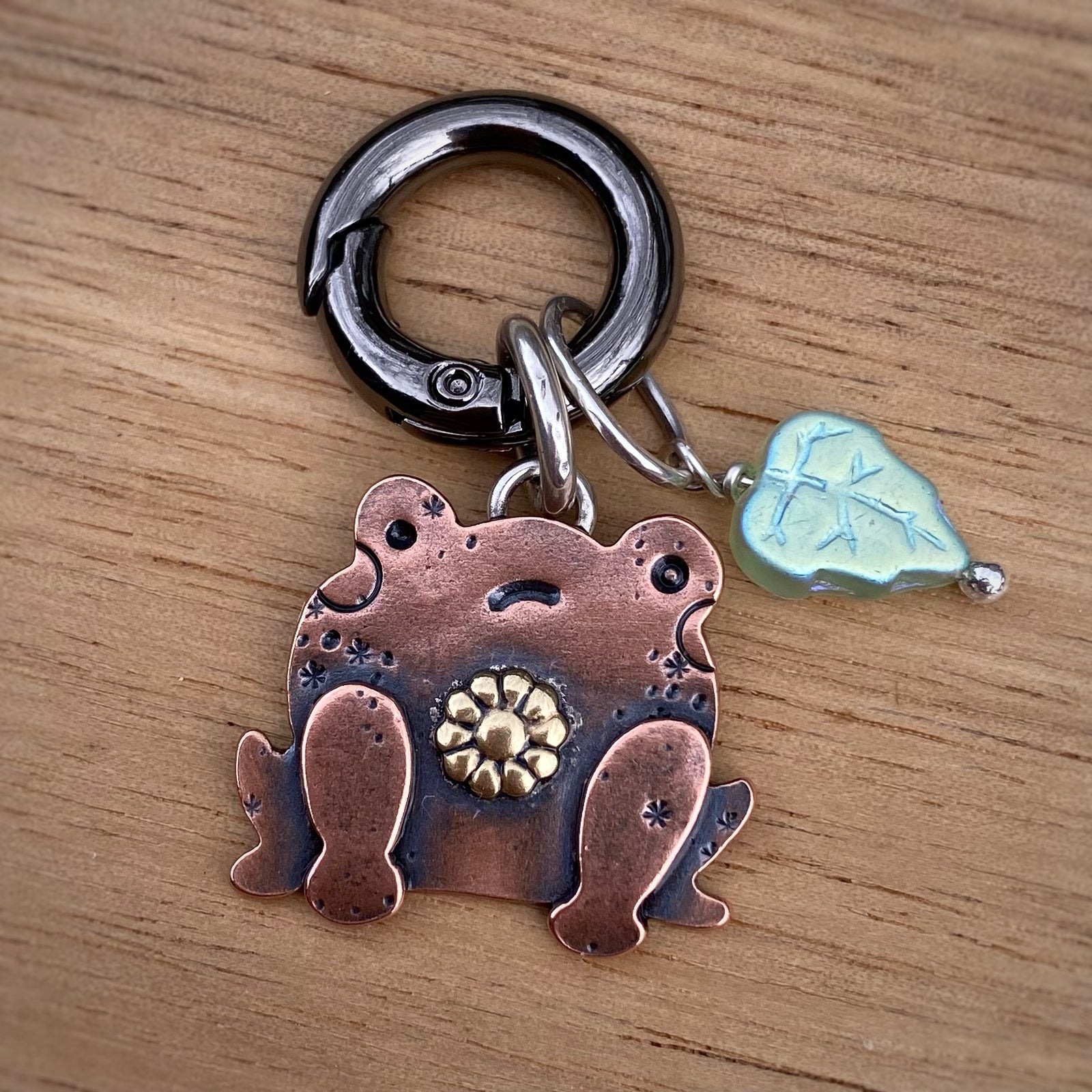 This charm is totally handmade from copper with sterling silver and brass accents. The leaf bead is glass.