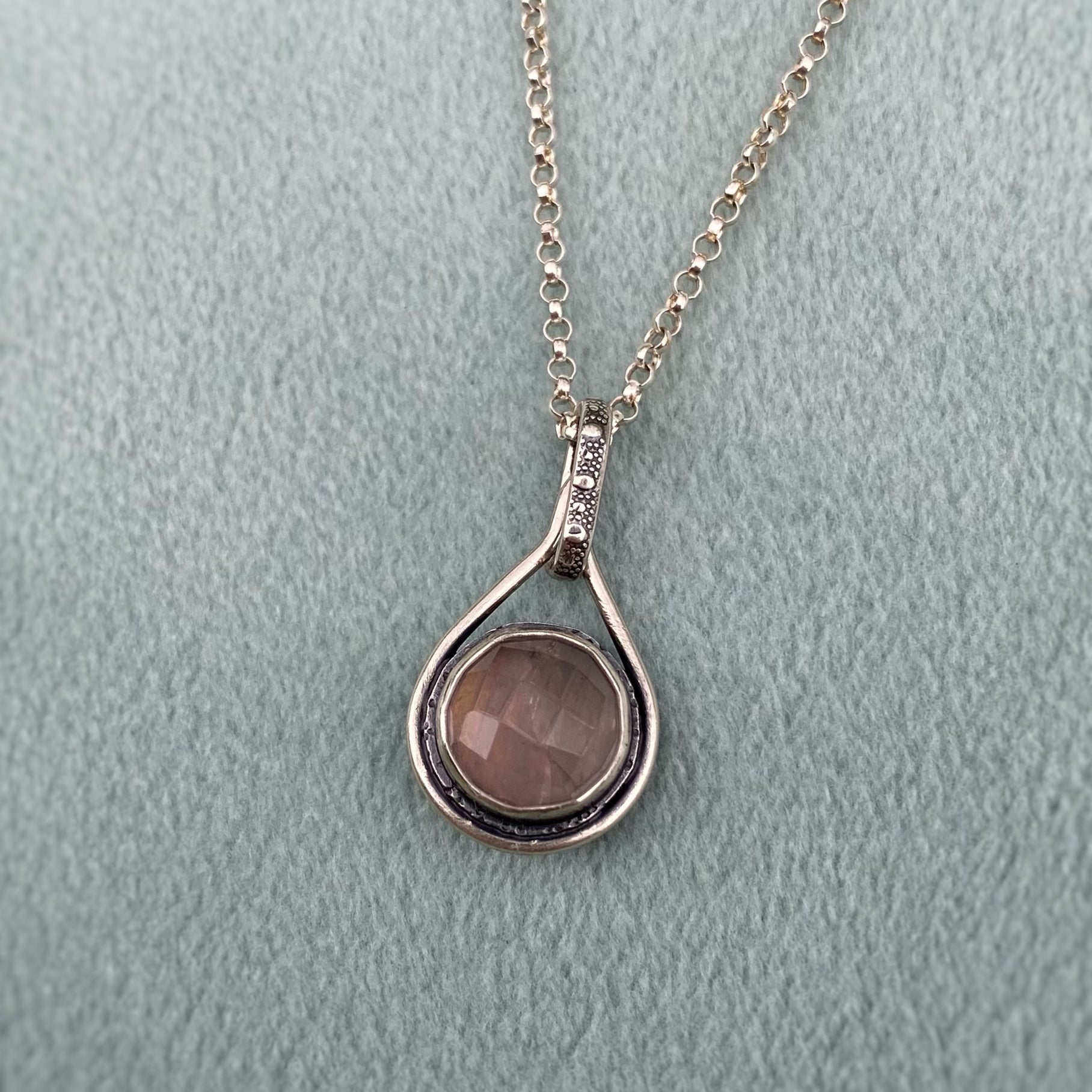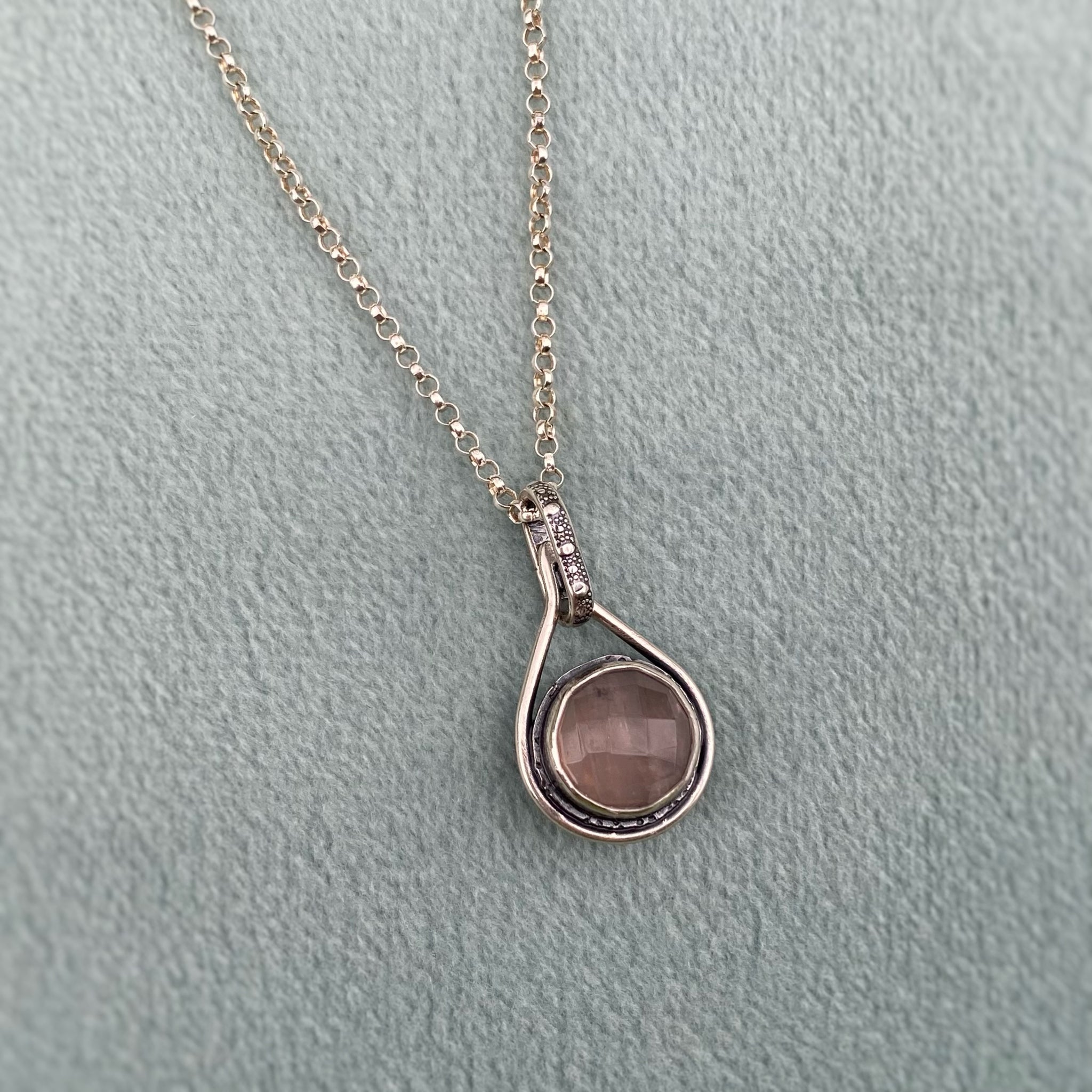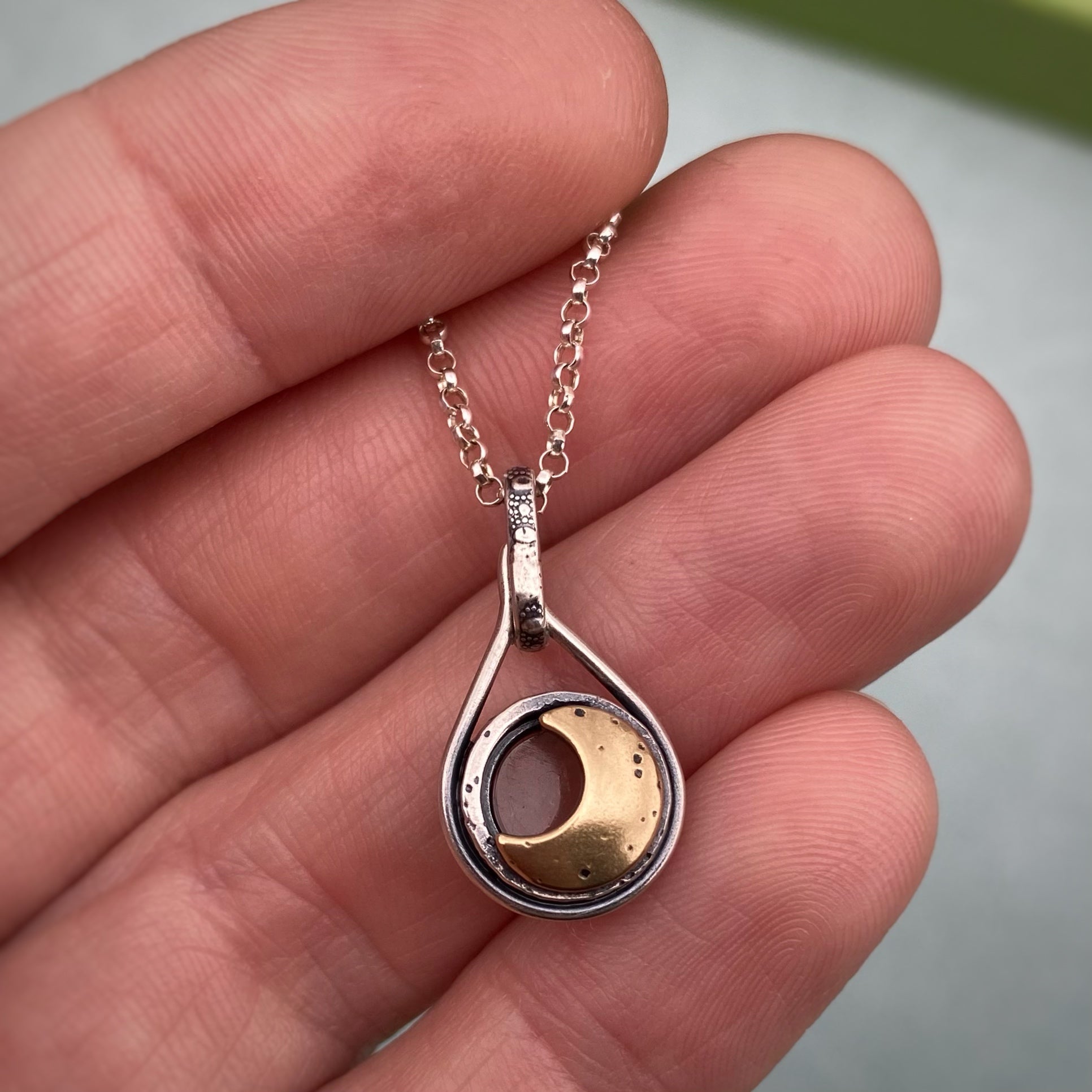 Wear this simple everyday piece either way! I‘ve set a rose cut rose quartz stone on one side of a handmade sterling silver setting, and a brass crescent moon on the other. There is no backing behind the stone so you can see it behind the moon side as well. :)