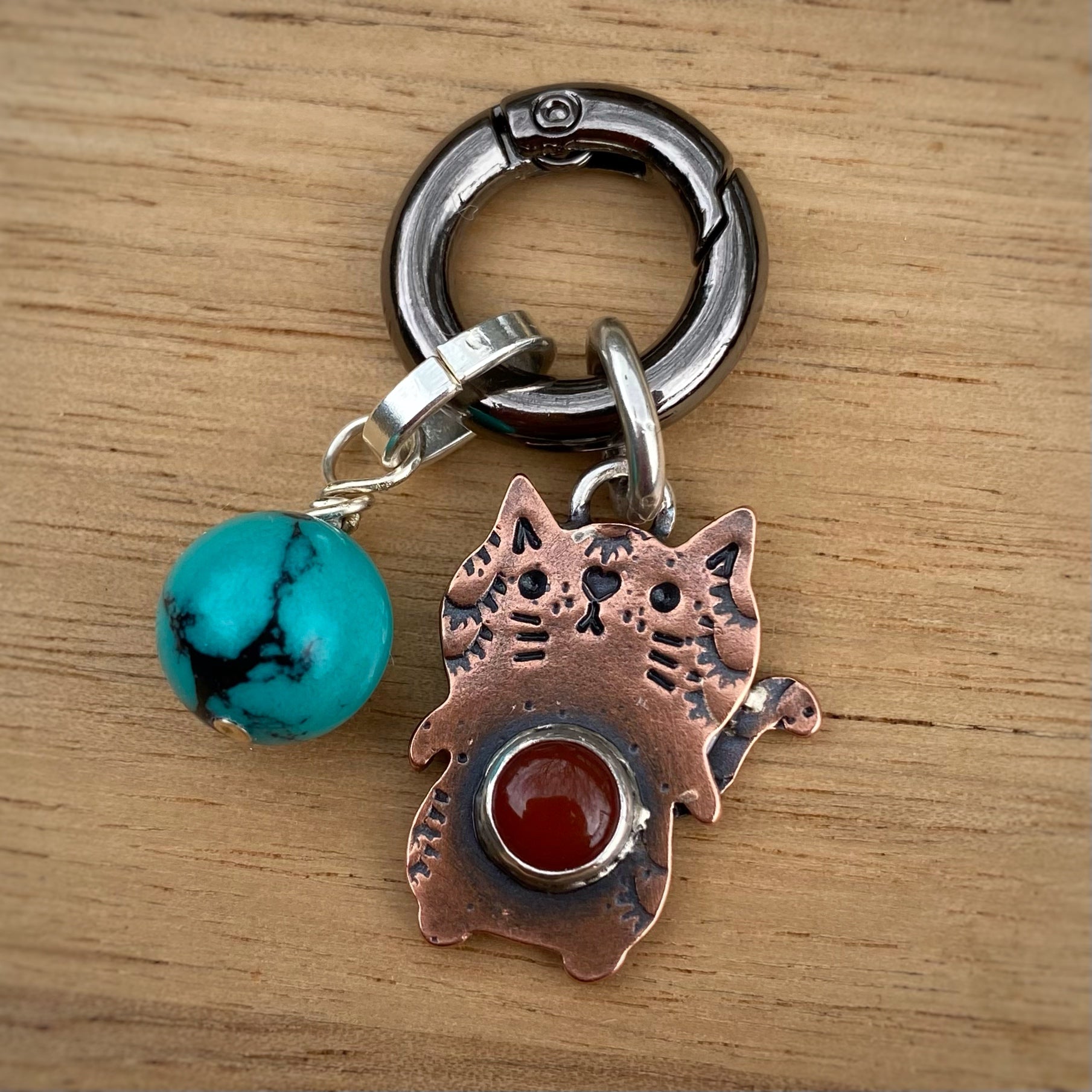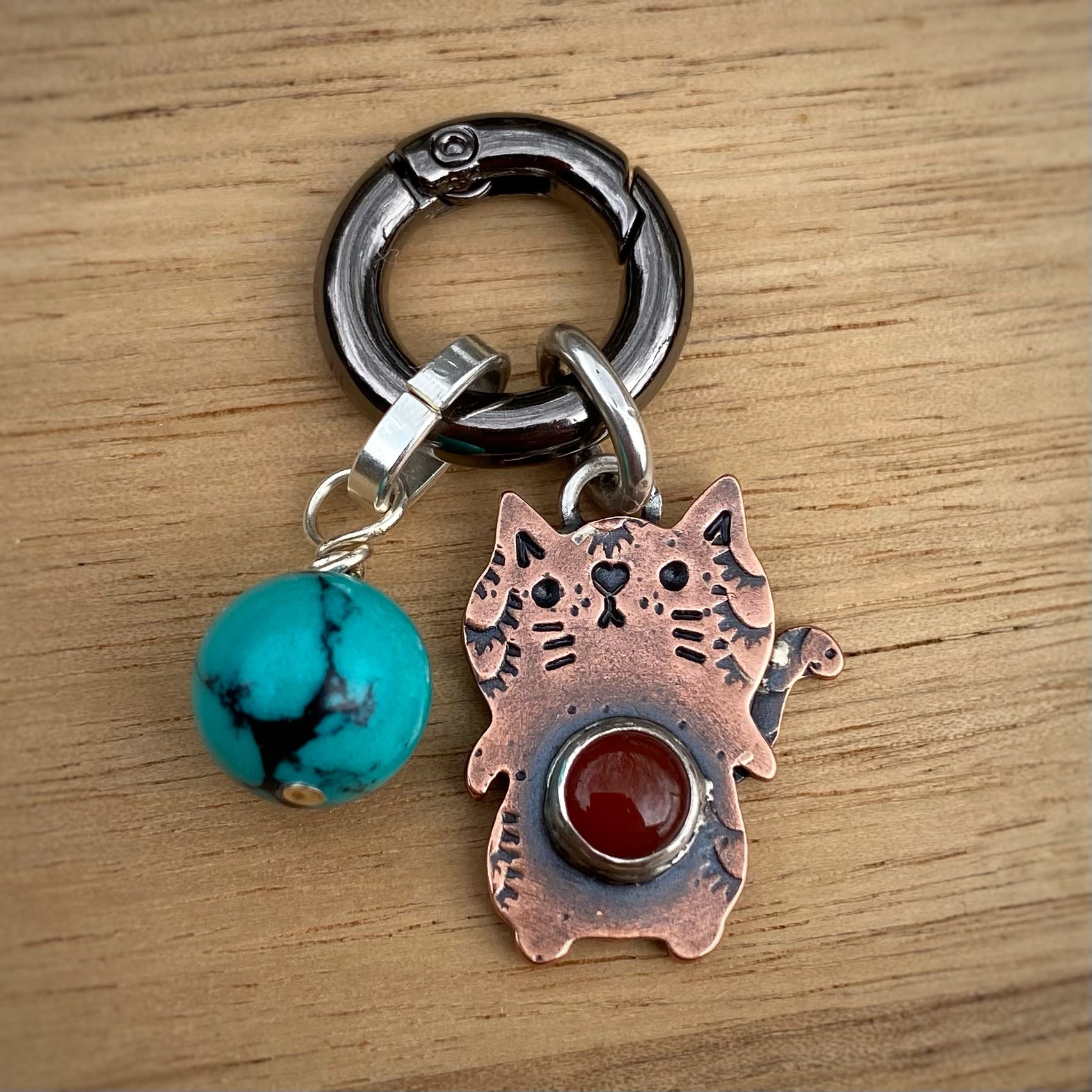 This charm is totally handmade from copper with sterling silver accents. The cabochon in his belly is carnelian. The bead is stone. The findings on the attached bead charm are base metal, NOT sterling silver.