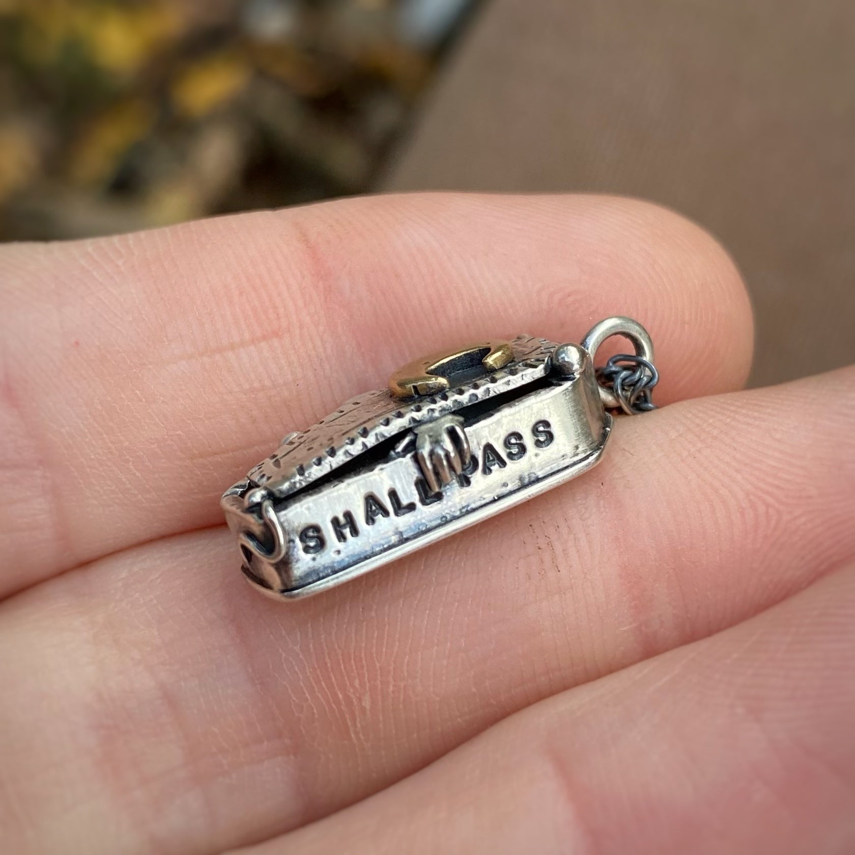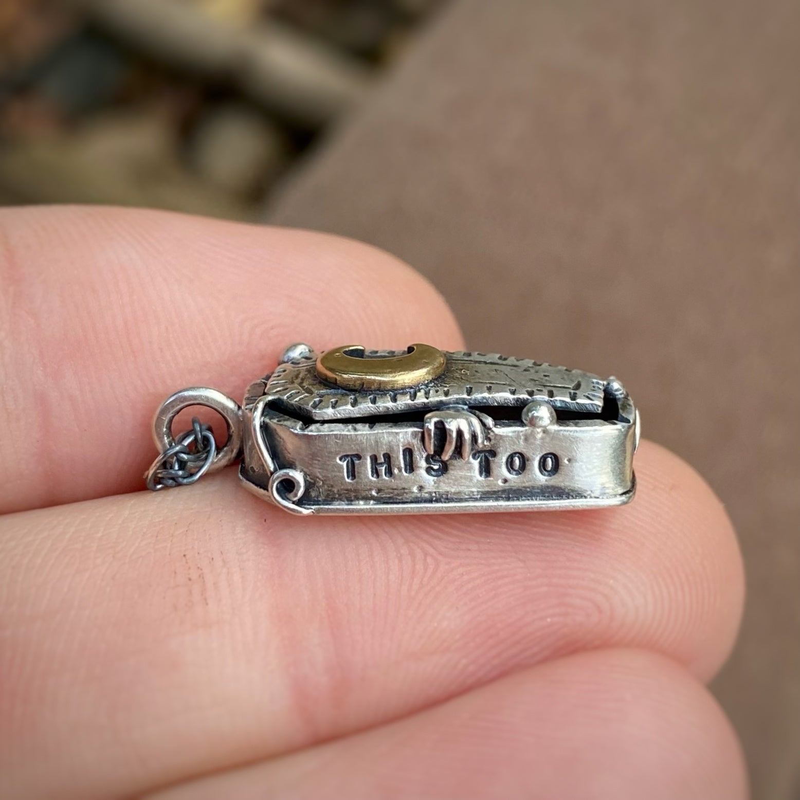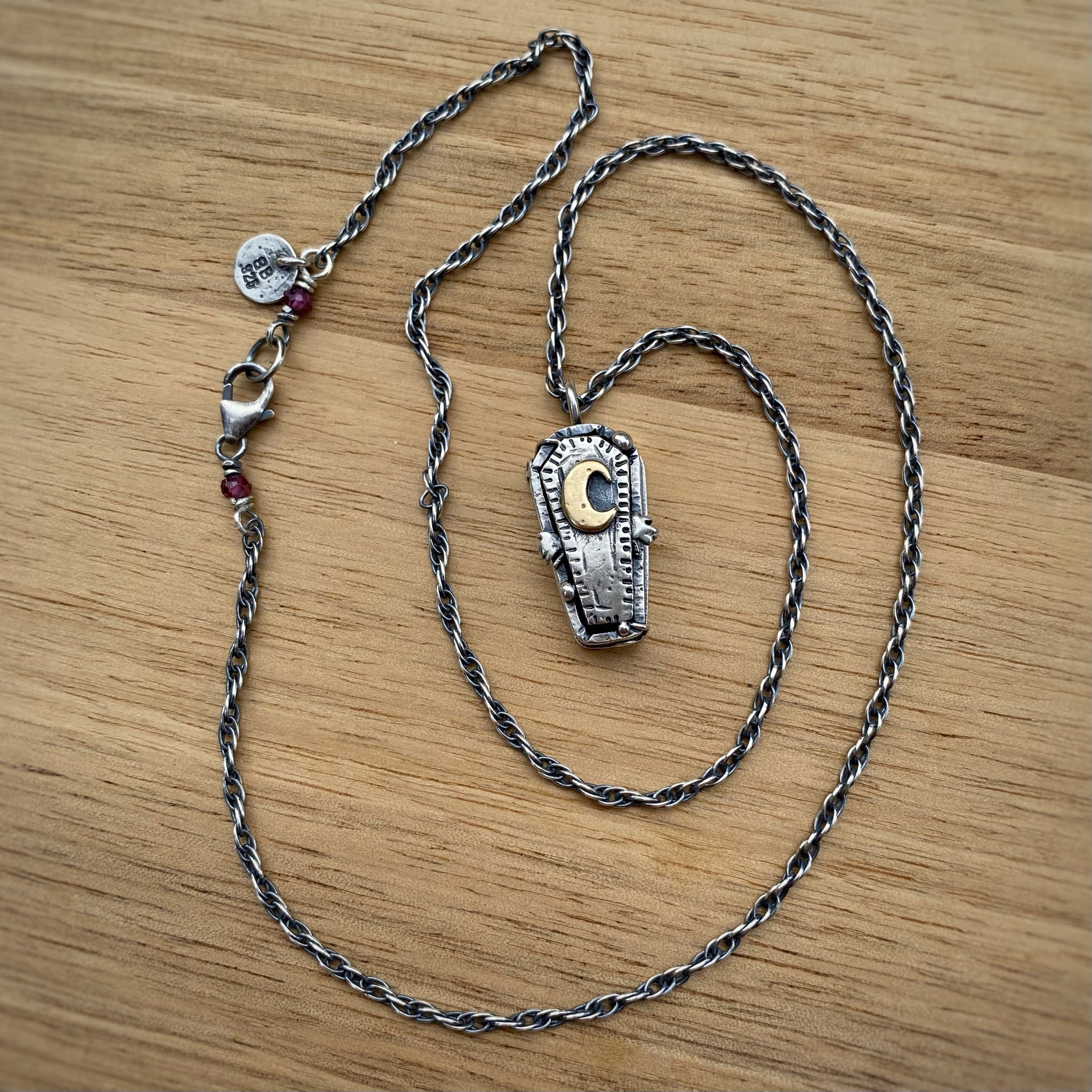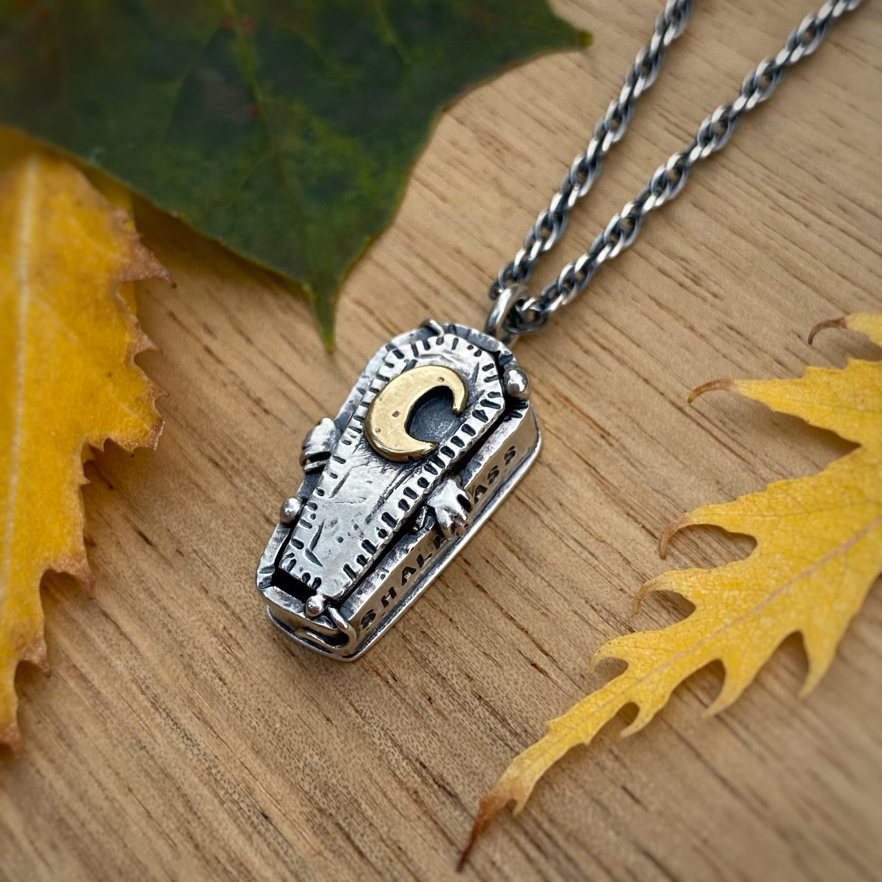 Creeeeeeepy. 😏 Teeny tiny details make this pendant the spookiest little accessory! I’ve handmade the entire coffin, and protruding hands, from sterling silver. There’s a brass moon accent on the coffin lid. “This too shall pass” is stamped around the border. Flip it around and wear it the other way to show off the marquise black onyx set inside!