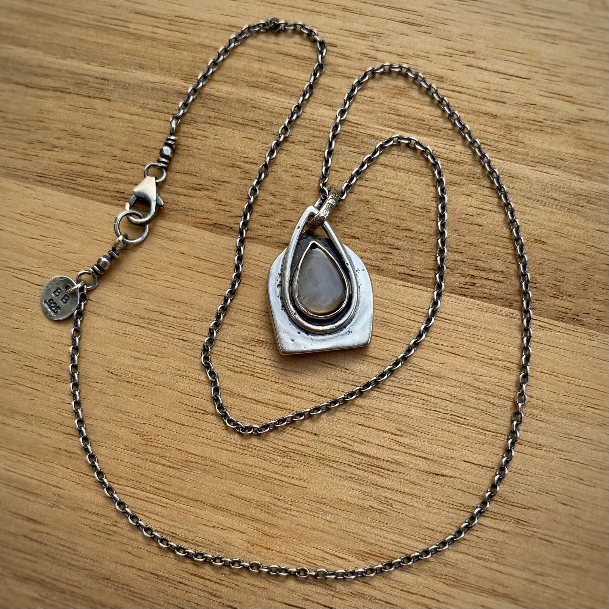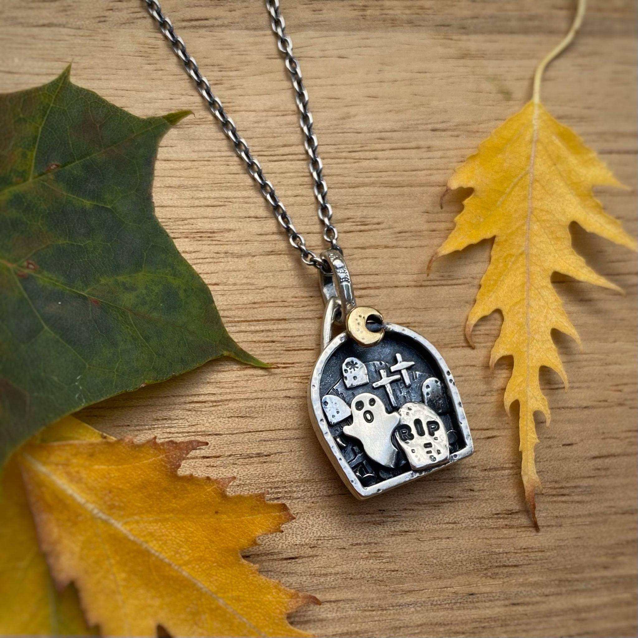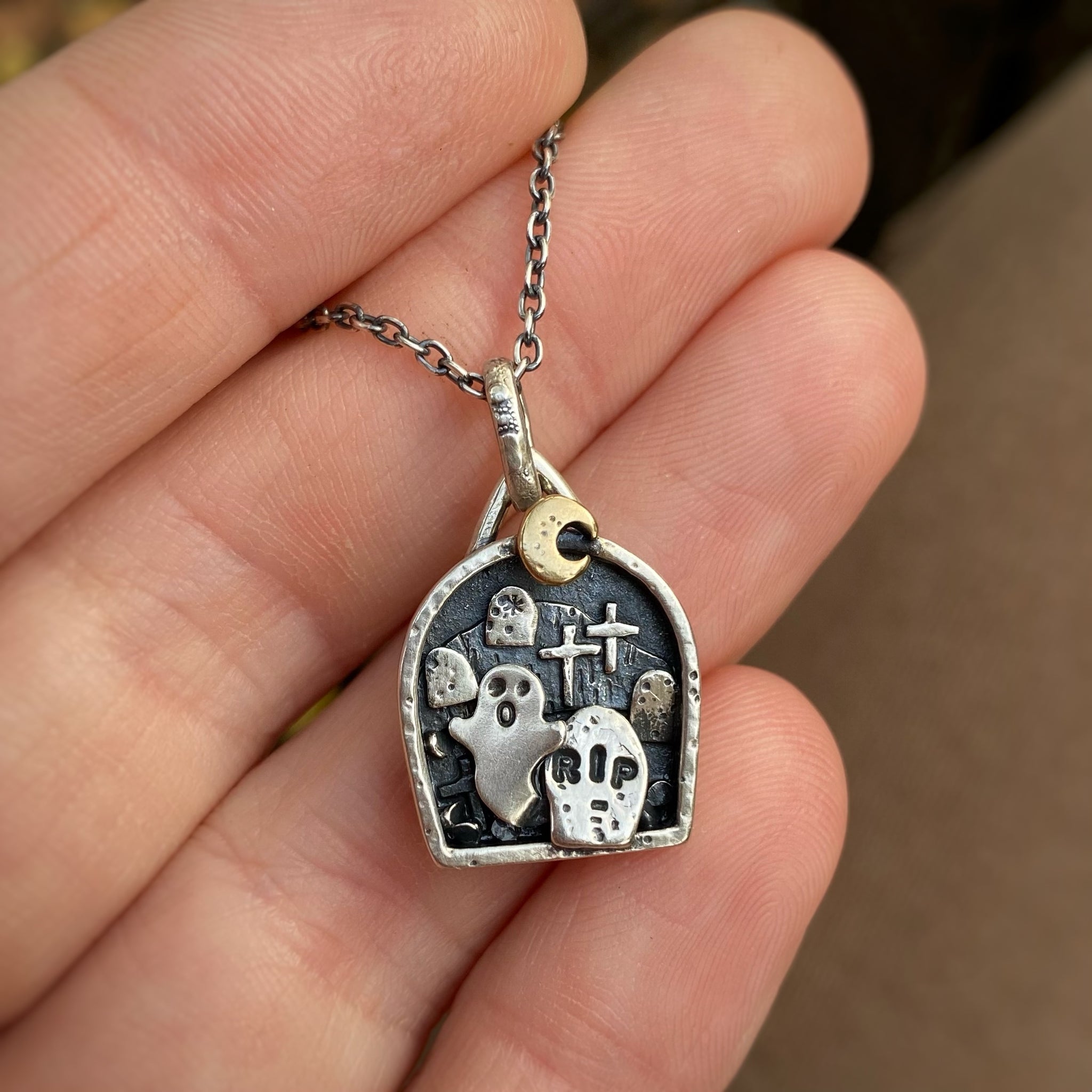 Two necklaces in one! I’ve handmade a spooky midnight graveyard scene from layered sterling silver, complete with a brass moon hanging above. On the opposite side, a black sapphire teardrop set on the back gives you a simple piece on days you want to change it up!