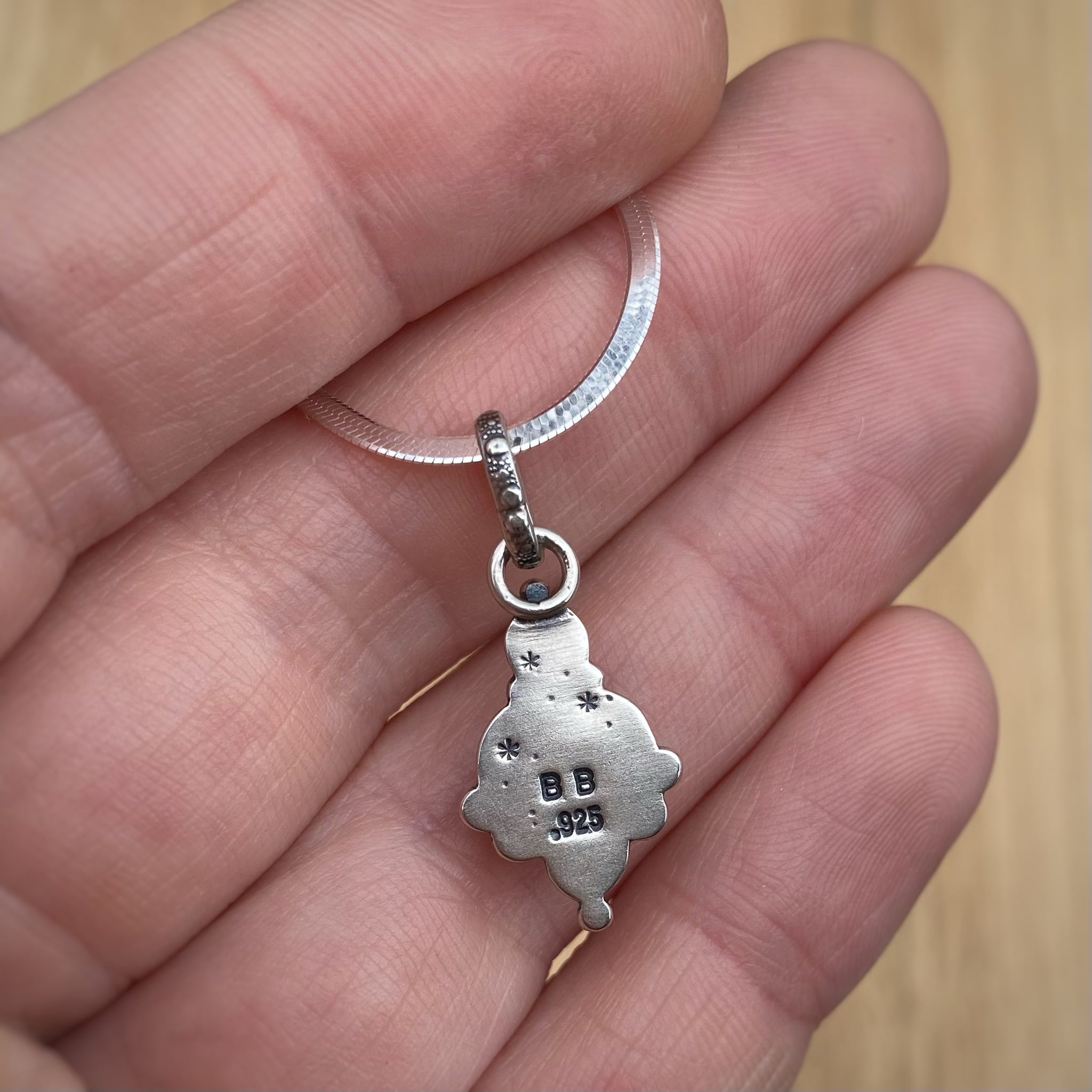 This necklace includes a sterling silver chain which closes with a lobster clasp at 16.”
