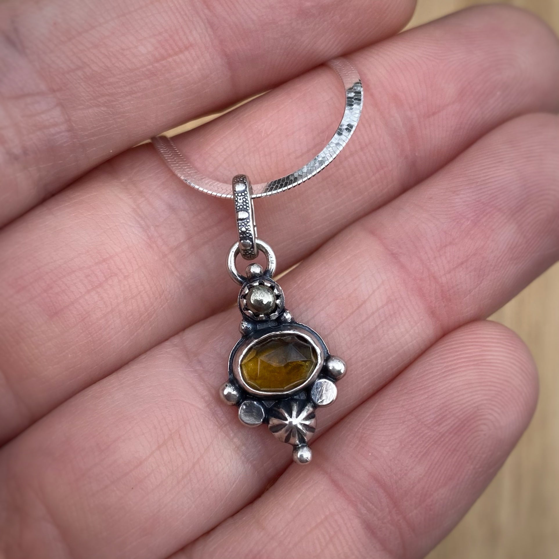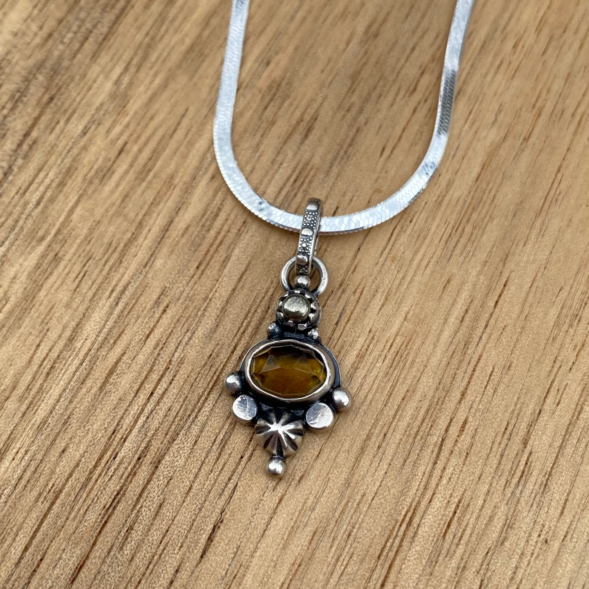 Lots of little details packed into these tiny statement necklaces! I’ve set a beautiful rose cut citrine and tiny pyrite stone into a completely handmade sterling silver setting.