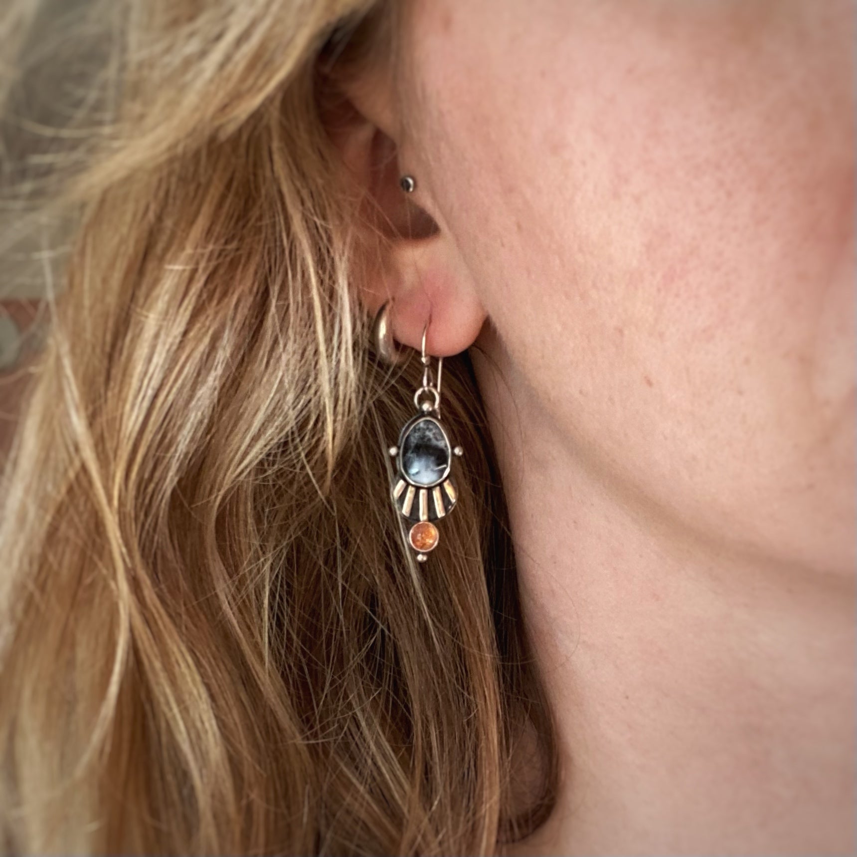 Halloween vibes but completely wearable all year long! I’ve set gorgeous black and white dendritic opals and sunstones in a completely handmade sterling silver setting.