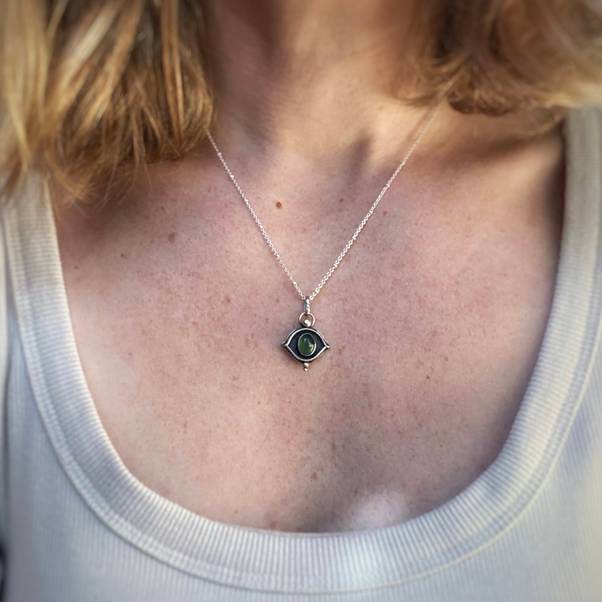 Simple and classic! A beautiful green serpentine is set in a completely handmade sterling silver setting.
