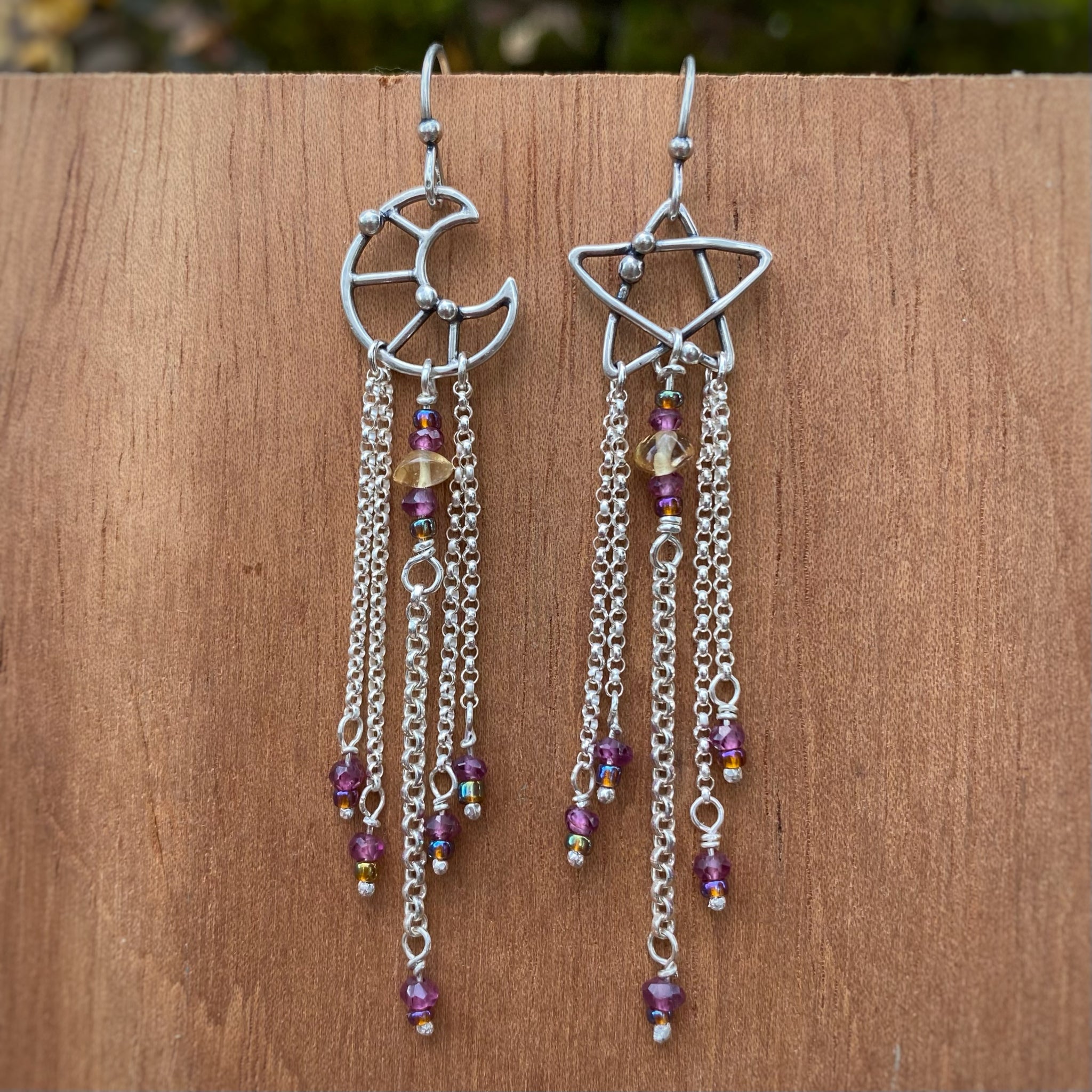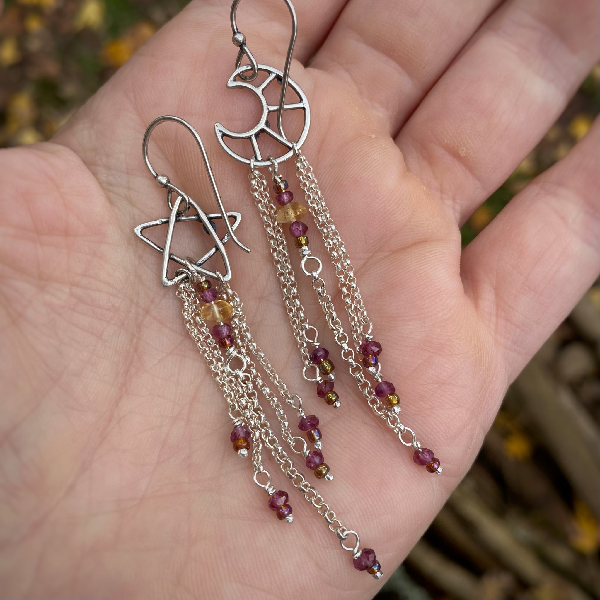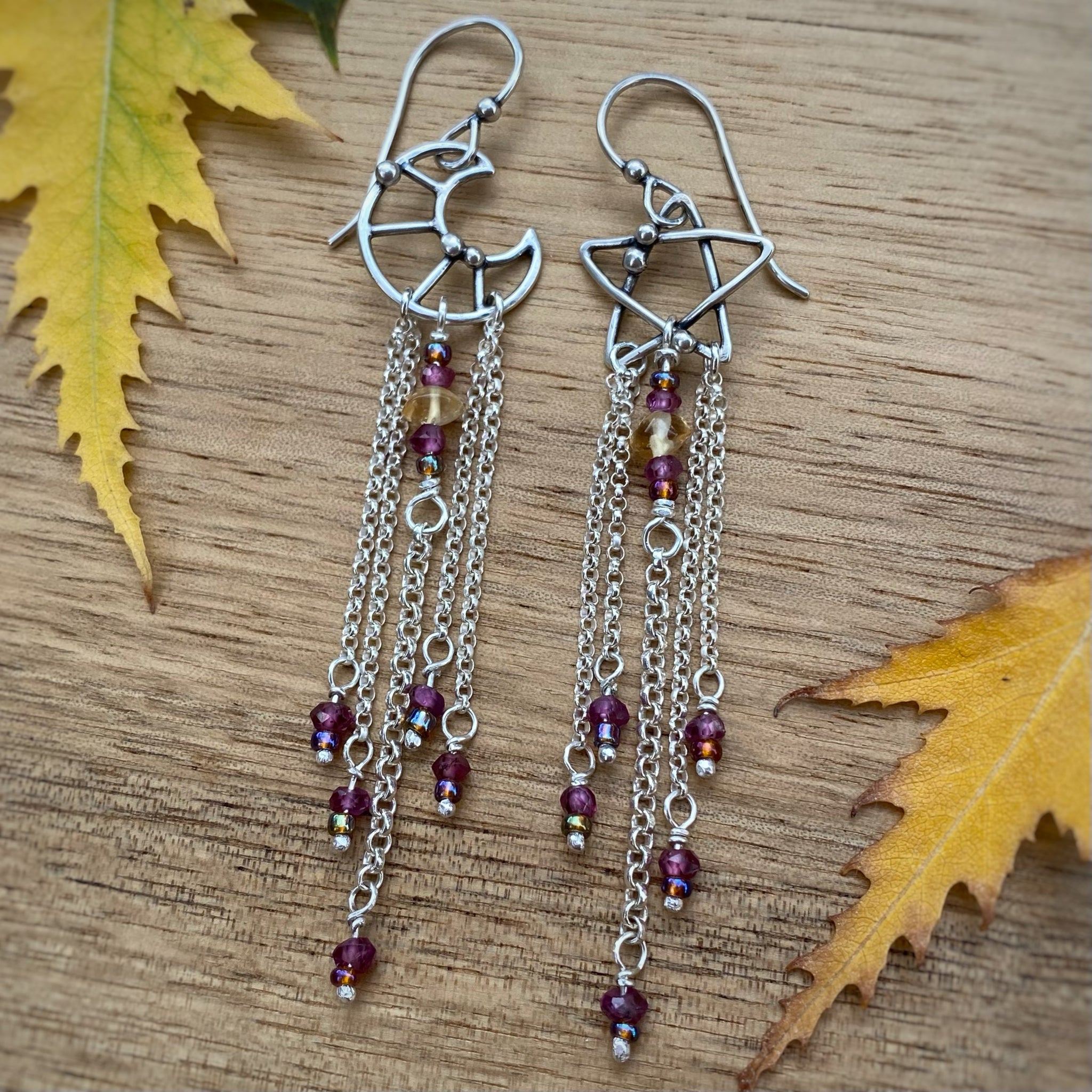 Fringe earrings are the most fun to wear, and that’s a fact! I’ve handmade a cute little moon and star from sterling silver wire, and added lots of sterling silver chain fringe to swish as you move. Glass, garnet, and citrine beads adorn the fringe.